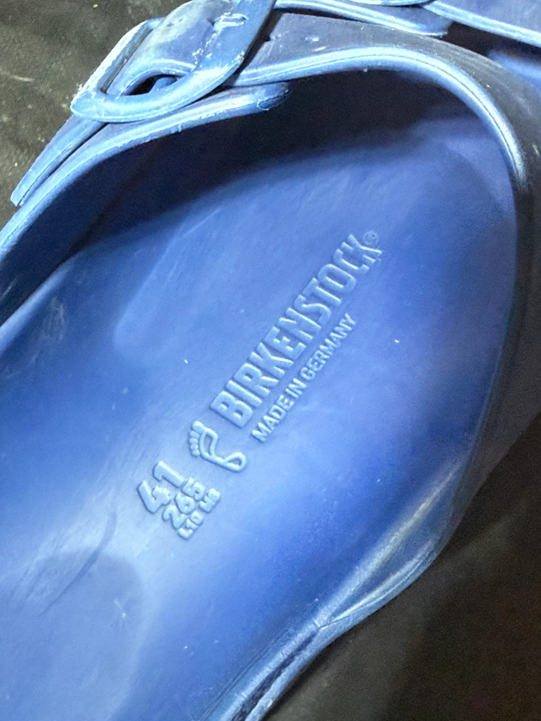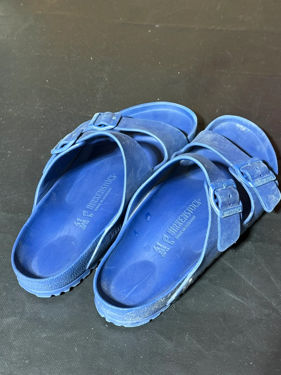 Blue Birkenstock Arizona EVA. Made in Germany. Size is 41, which is 26.5 cm or US Men's 8-8.5 / Women's 10-10.5.