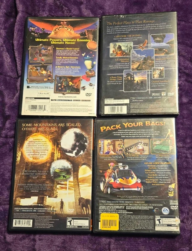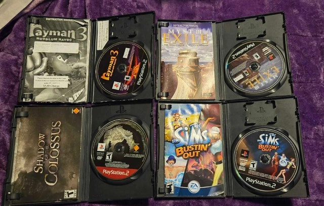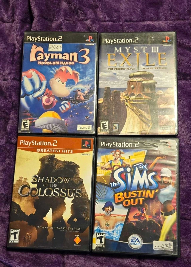 Rayman 3 Hoodum Havoc $15, Myst III Exile $10, Shadow of the Colossus $10, The Sims Bustin' Out $10. Located in Stony Plain. Can meet in Millwoods during weekdays around 3:45 PM or potentially the west end around 4 PM.