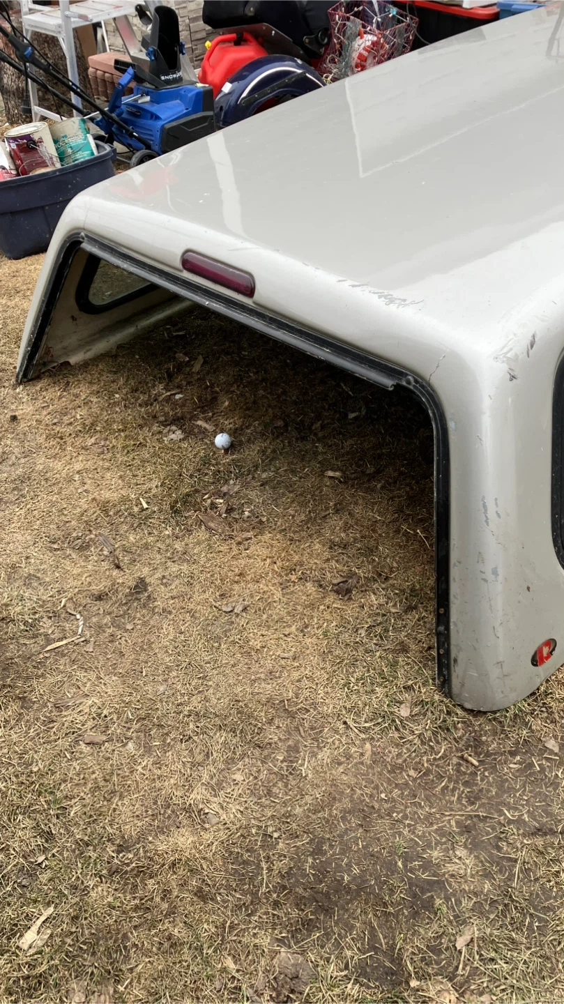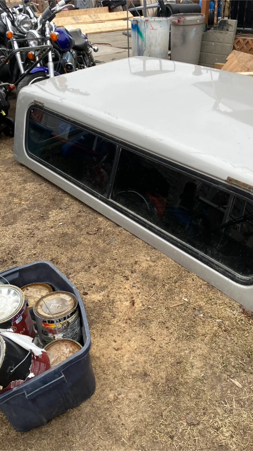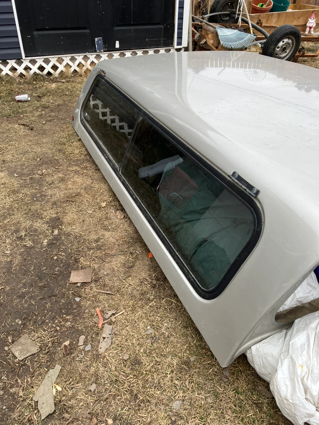 This is a silver truck cap, likely for a full-size pickup. It has tinted side windows and a top brake light. Some wear and tear is visible on the exterior. There is no window in the back and on the other back only the two sides have windows free. Size 5 x 7.