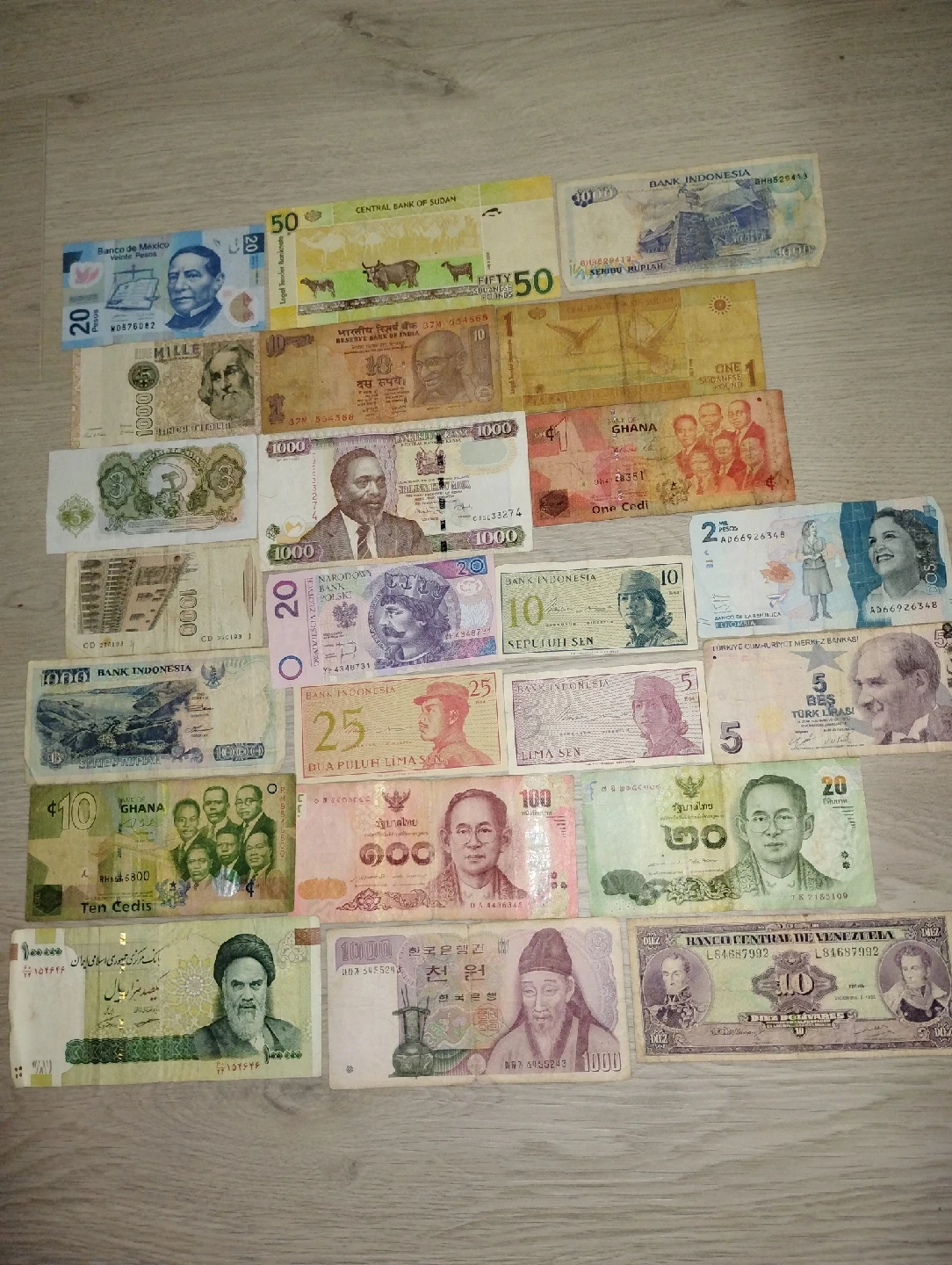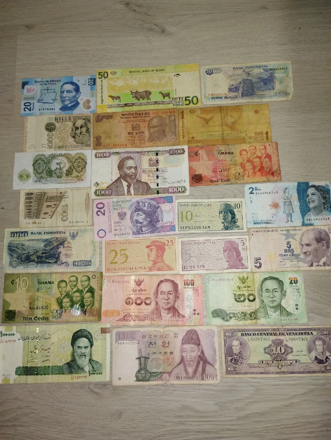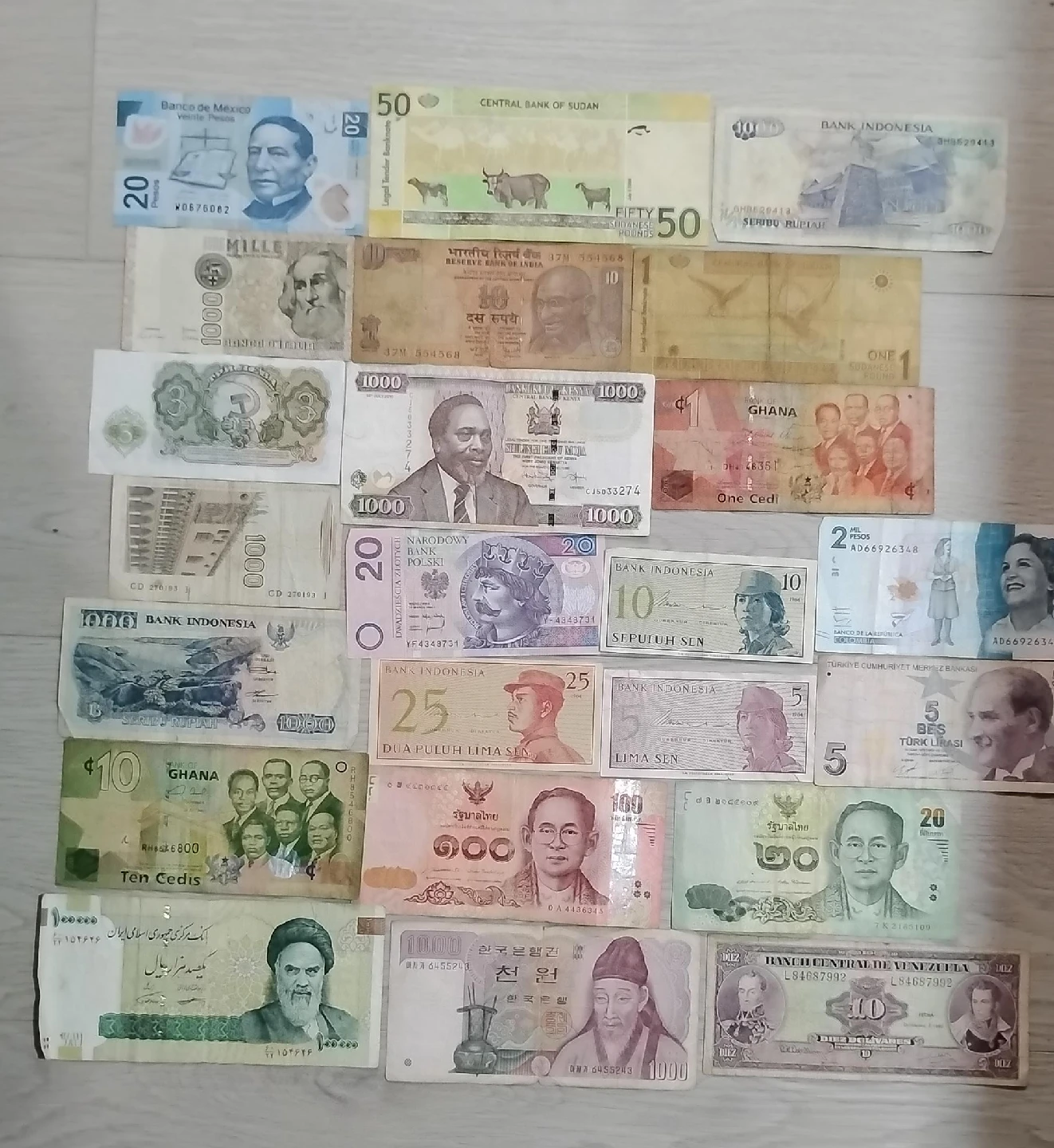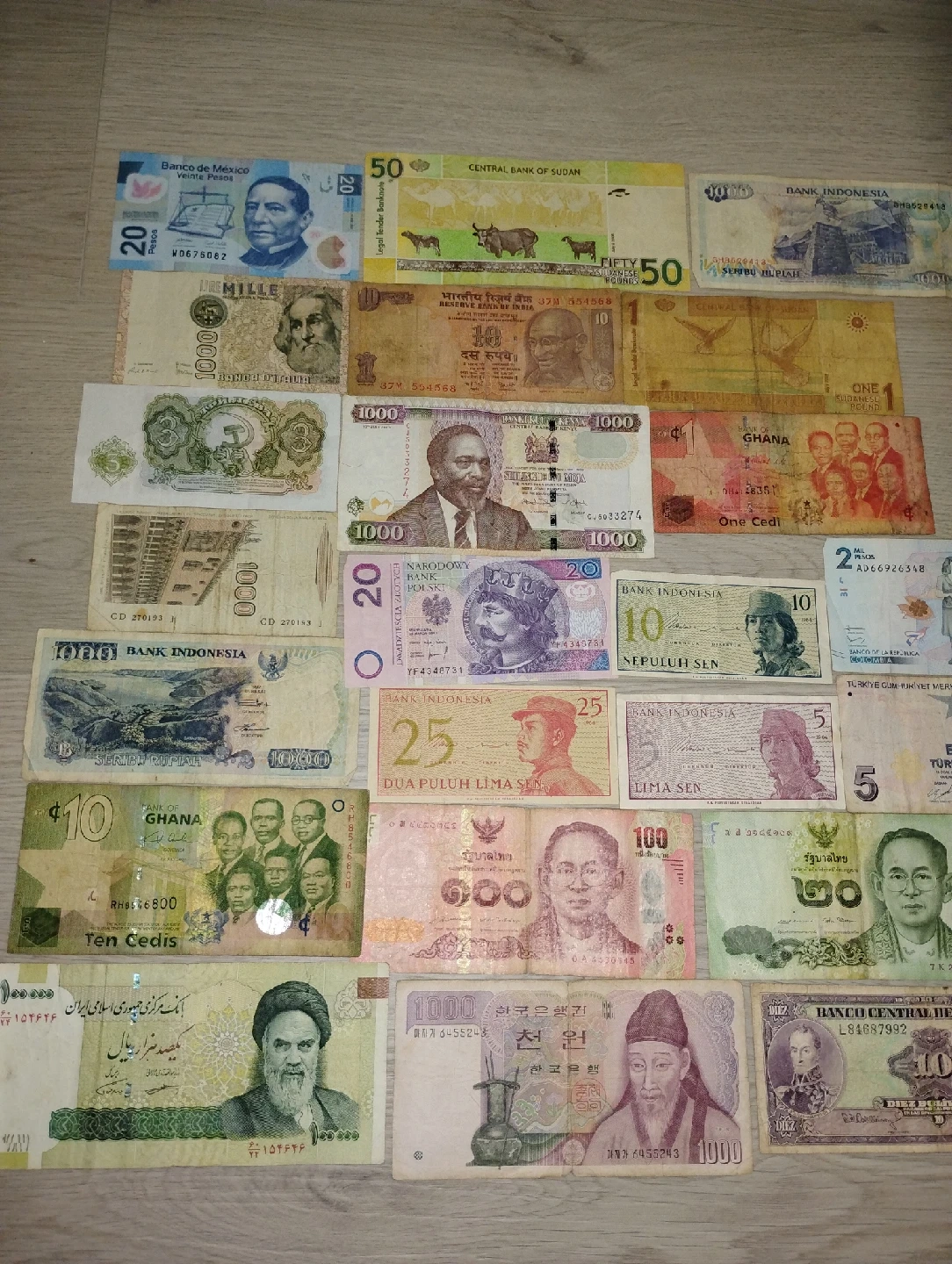 301A collection of various international currencies. Includes notes from Mexico, Sudan, Indonesia, India, Ghana, Poland, and more. A fascinating assortment for collectors or those interested in world currency!