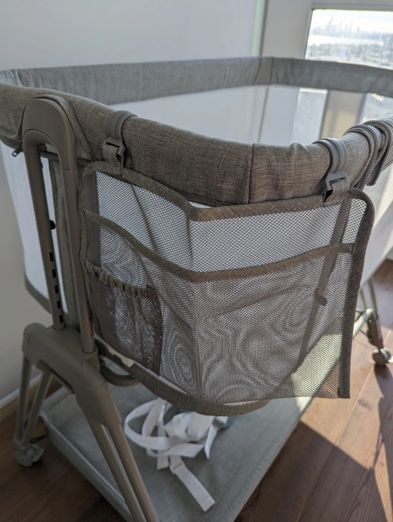 One side has zips and lowers to have easy access to baby, which helps a lot during night feedings or to pick up/play/be closer to baby. Bassinet has straps to attach to bed, however we didn't use these.