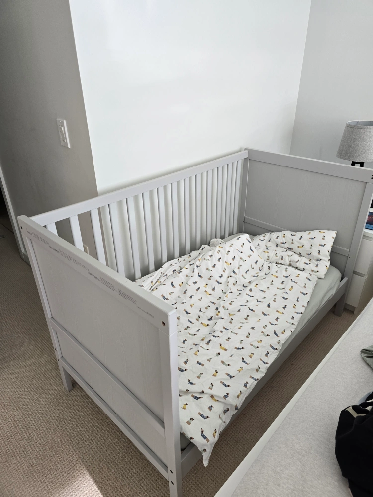 One crib side can be removed when the child is big enough to climb into/out of the crib.