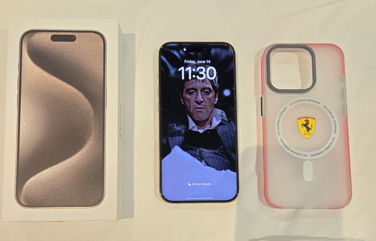 iPhone 15 pro in box 256gb color titanium battery health 100% including Ferrari case and screen protector anti glare