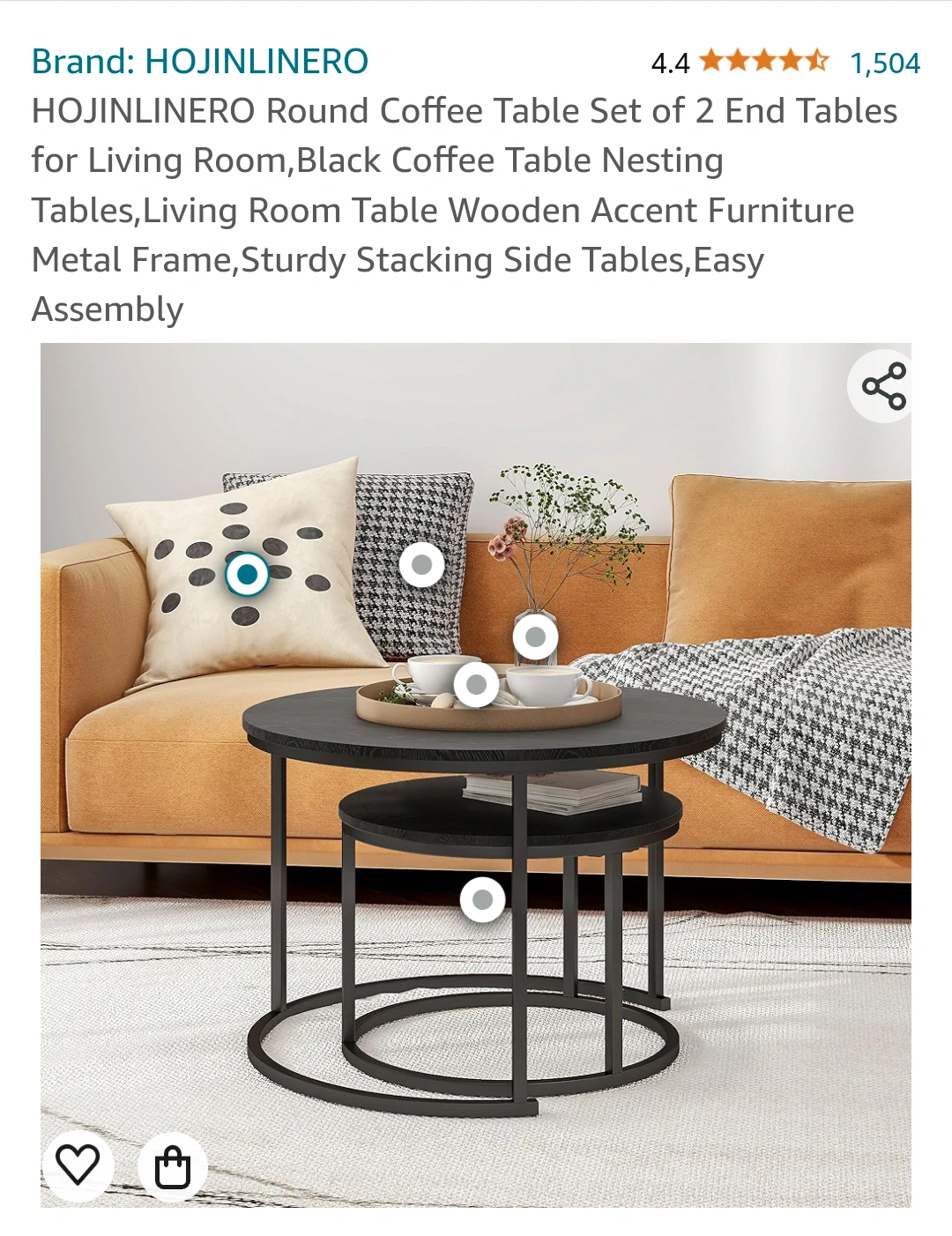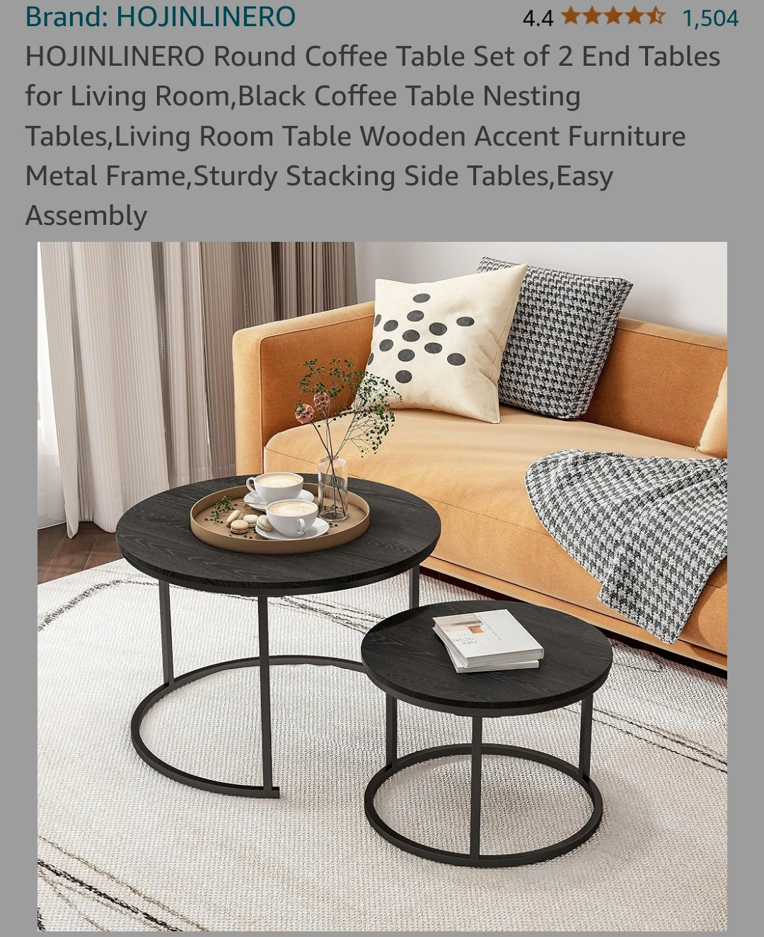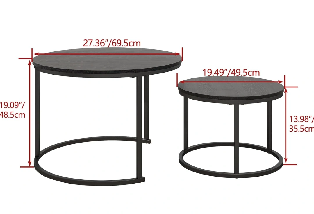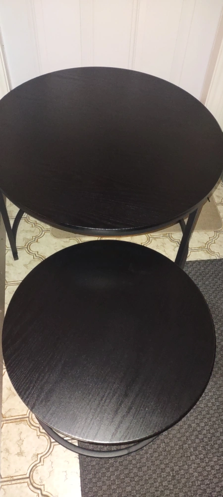 Two piece black, round coffee table. Made of wood and metal. Very sturdy, simple and multi functional. Use as end tables, coffee table, accent table, together as nesting tables or seperate pieces in different rooms. lots of options !!