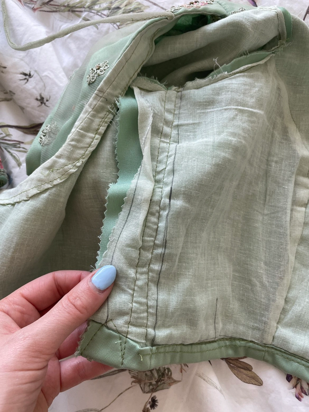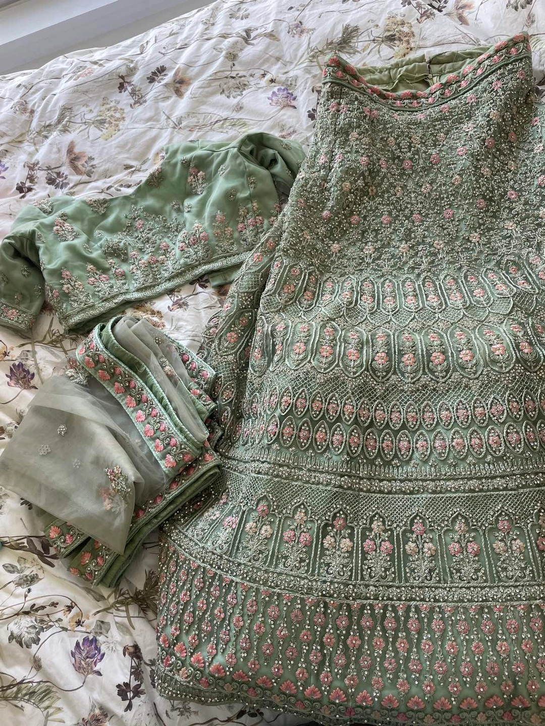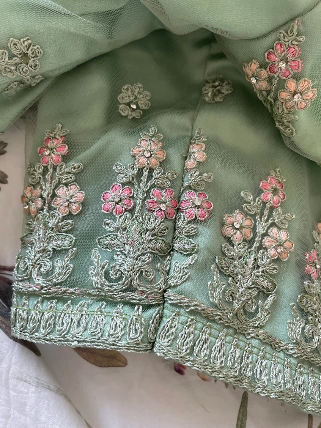 Stone work and embroidery all over the lehenga and embroidery in blouse. Sage green with silver and pink work, cancan under the skirt - very heavy and thick.