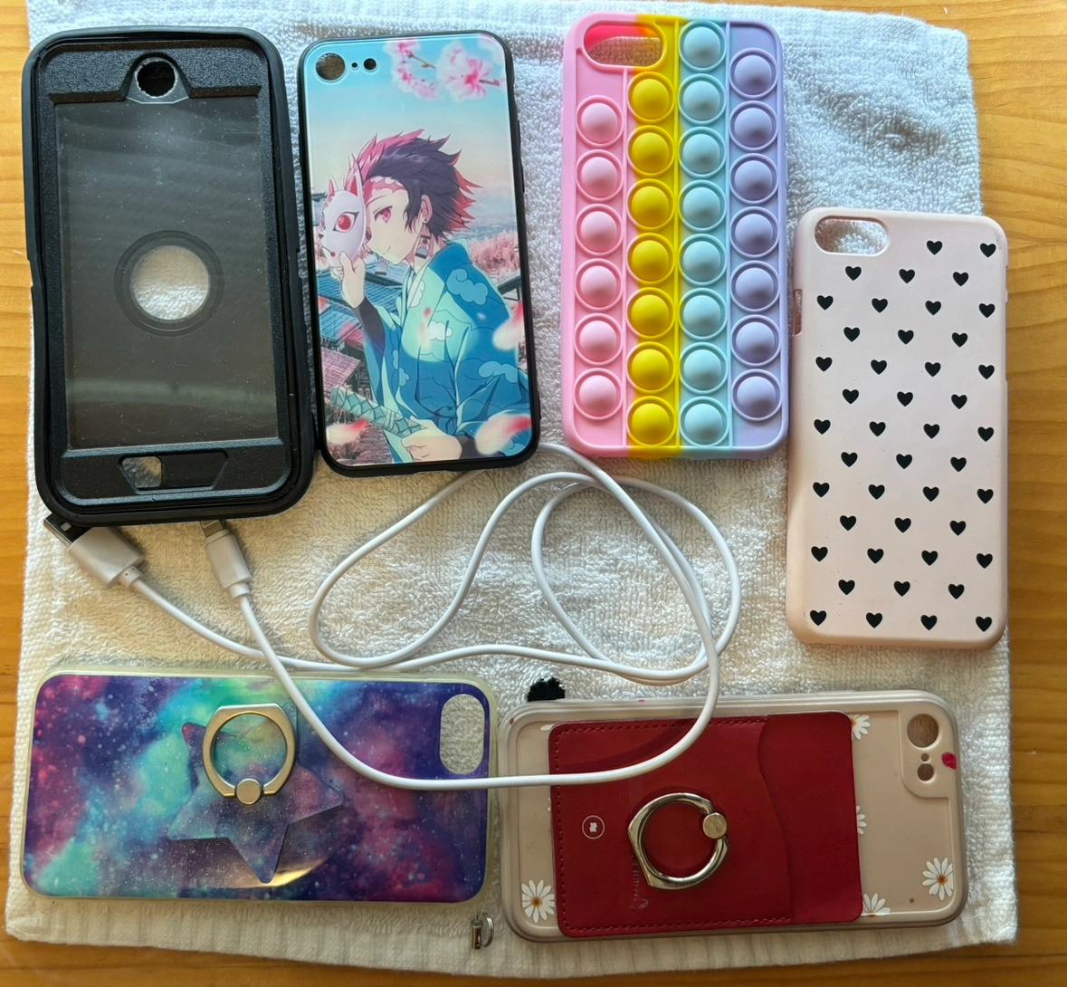 The phone comes with a non Apple brand charging cable and SIX iPhone protective cases as you see in pic number 4.