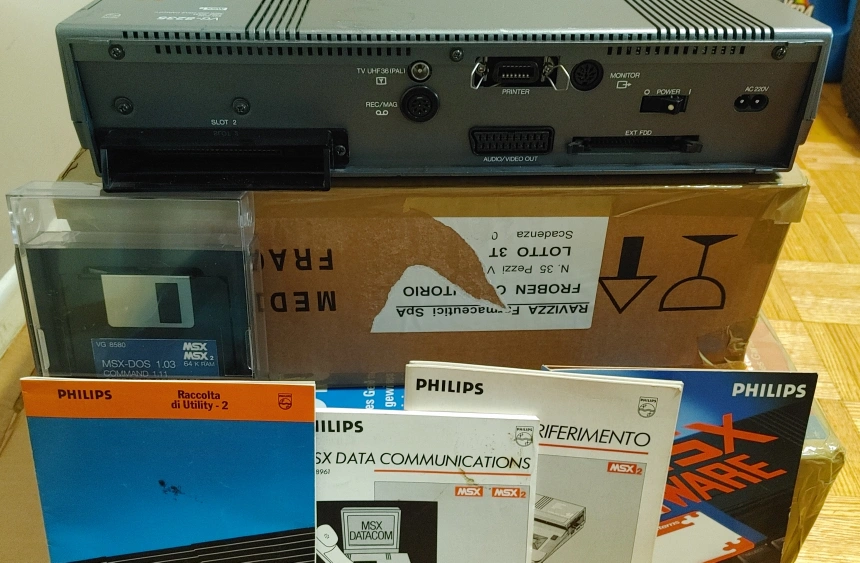 Very rare European MSX2 computer made by PHILIPS, in great cosmetic condition, together with all its Manuals and Floppy Disks (in Italian language).