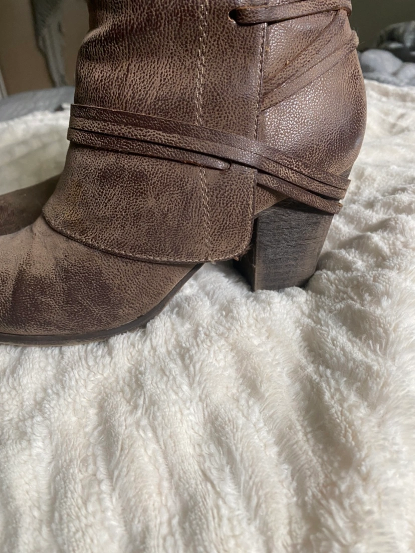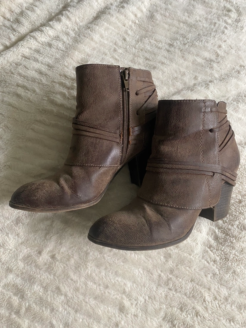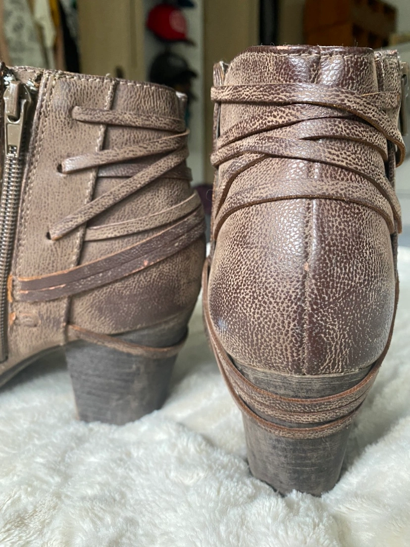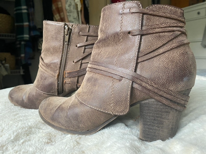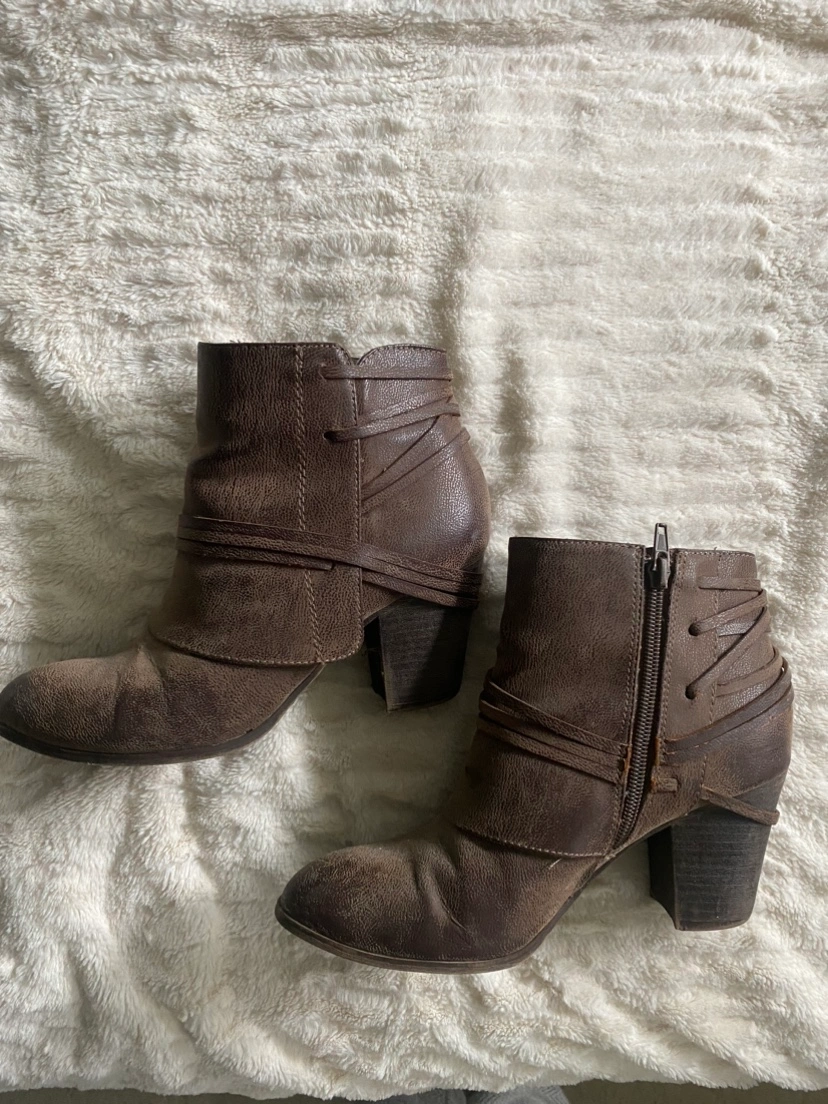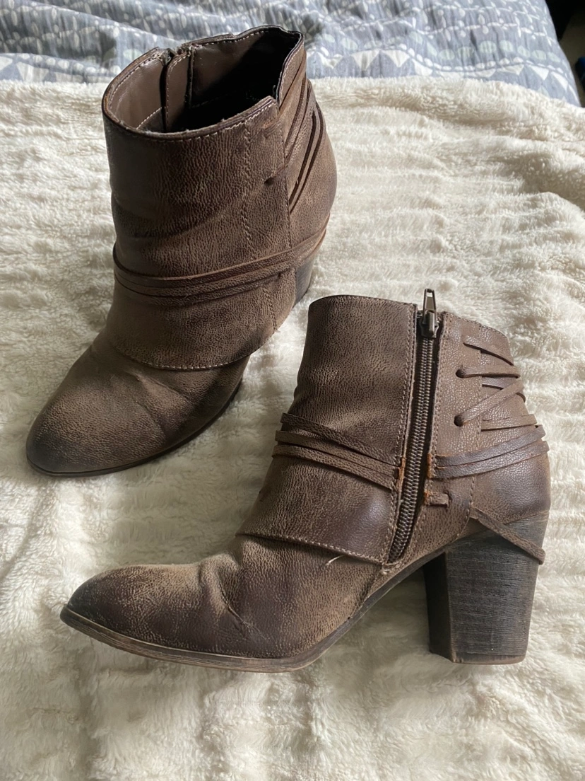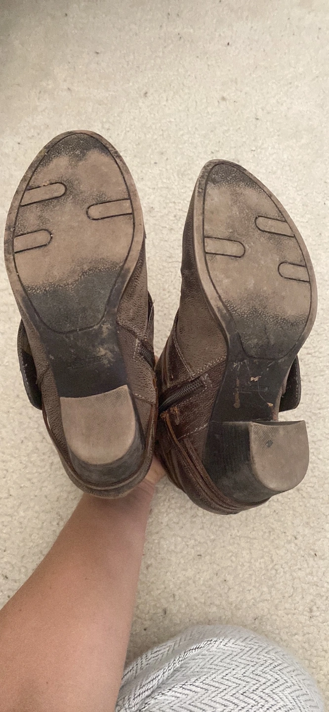 Medium brown with a dusty weathered look & feel. Worn probably 10 times over 6 years. I’ve held onto them because they are unique and comfortable - I often wore an insole. They are a stable 1.5 inch chunky heel.