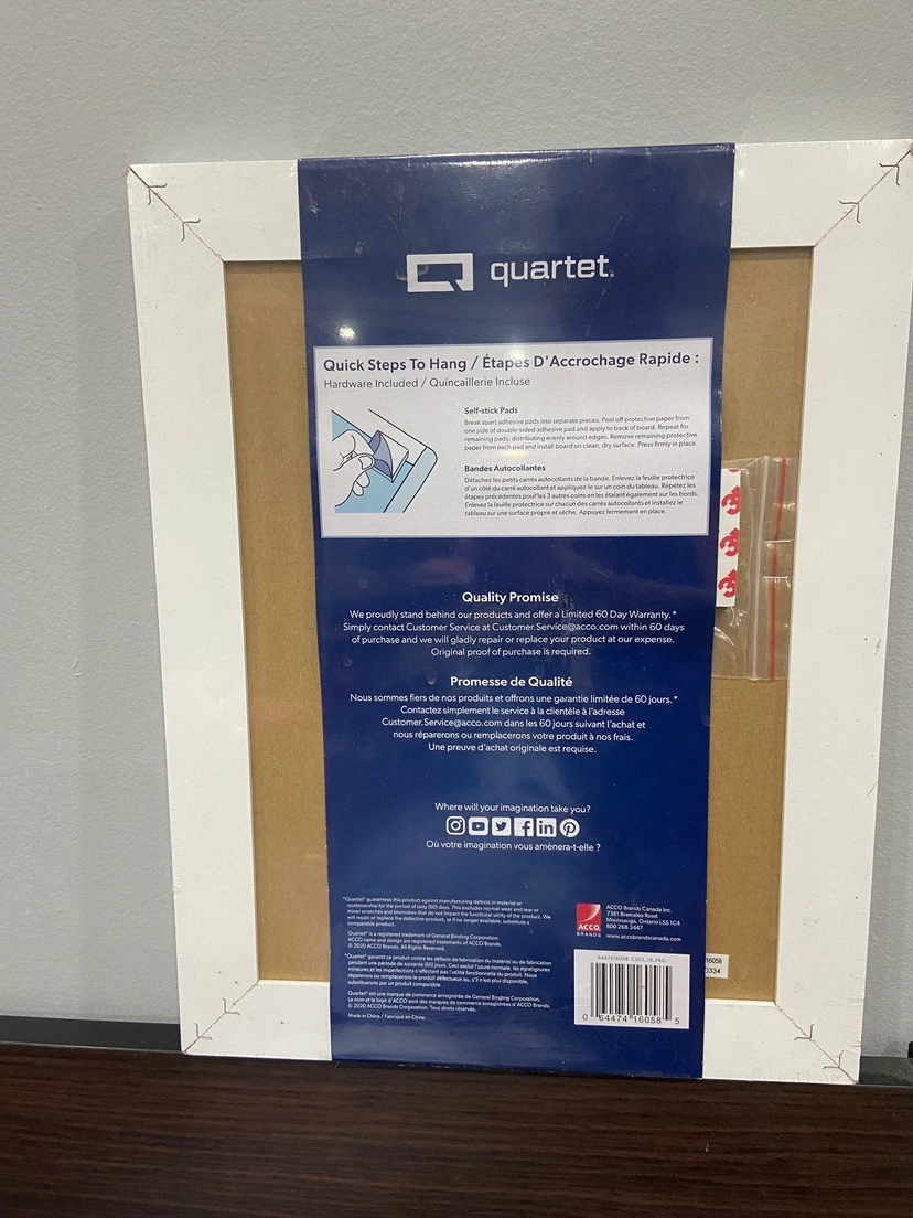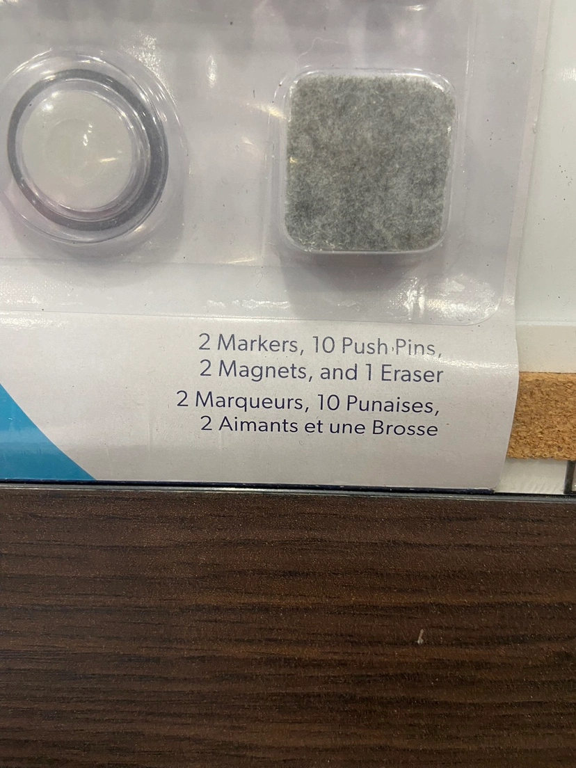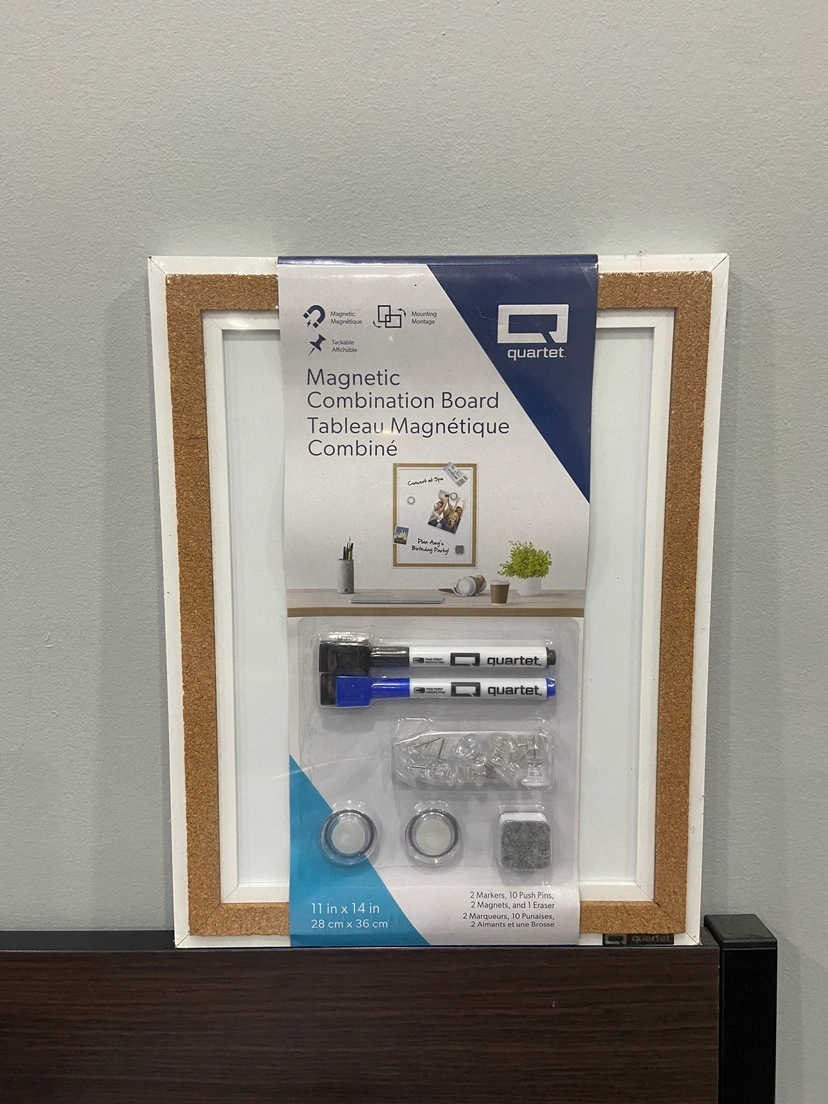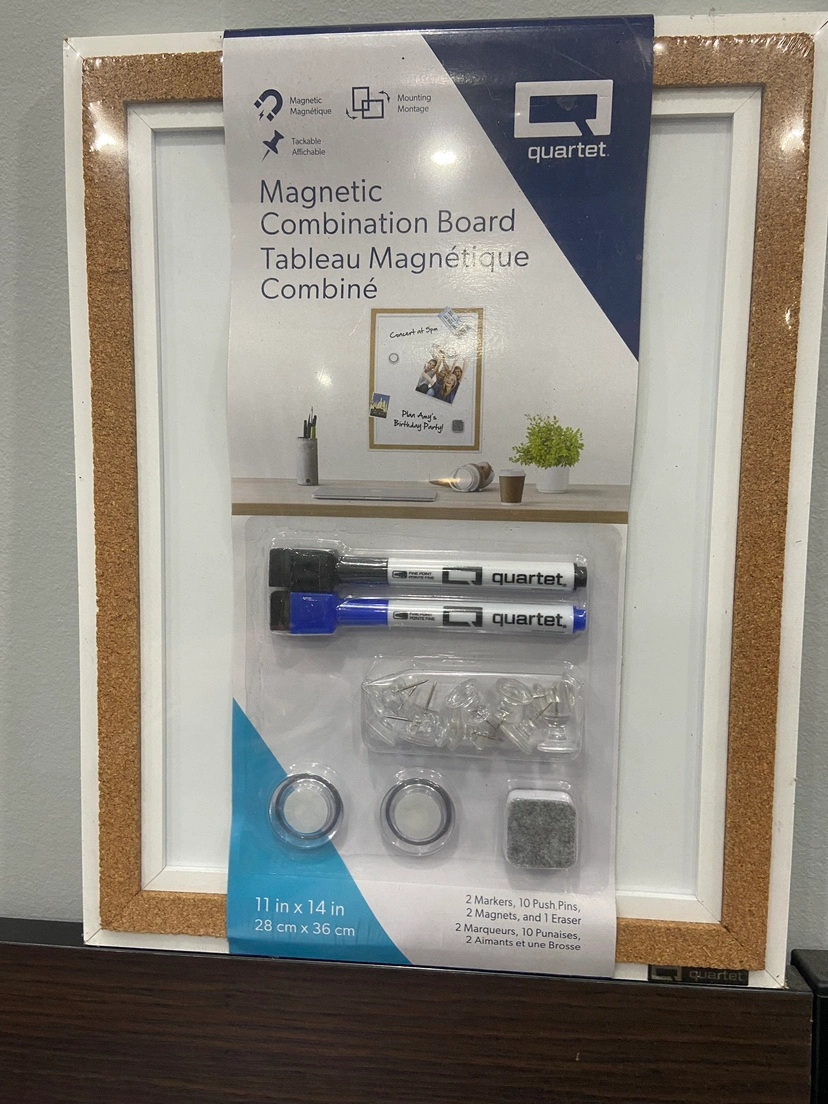 White board - cork board. Brand new in plastic. Includes board, markers, magnets, pushpins, wall mount pads, and eraser.