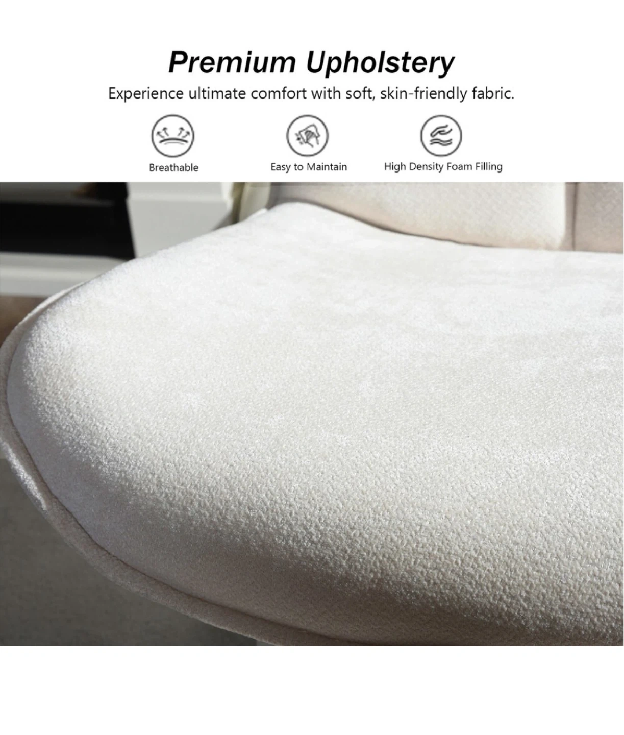 Comfortable off-white fabric chair. Features lumbar support, tilting function, and 360° swivel. Ergonomic design. Black metal base. Ideal for office or home use.