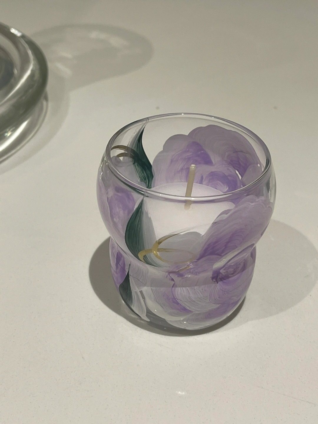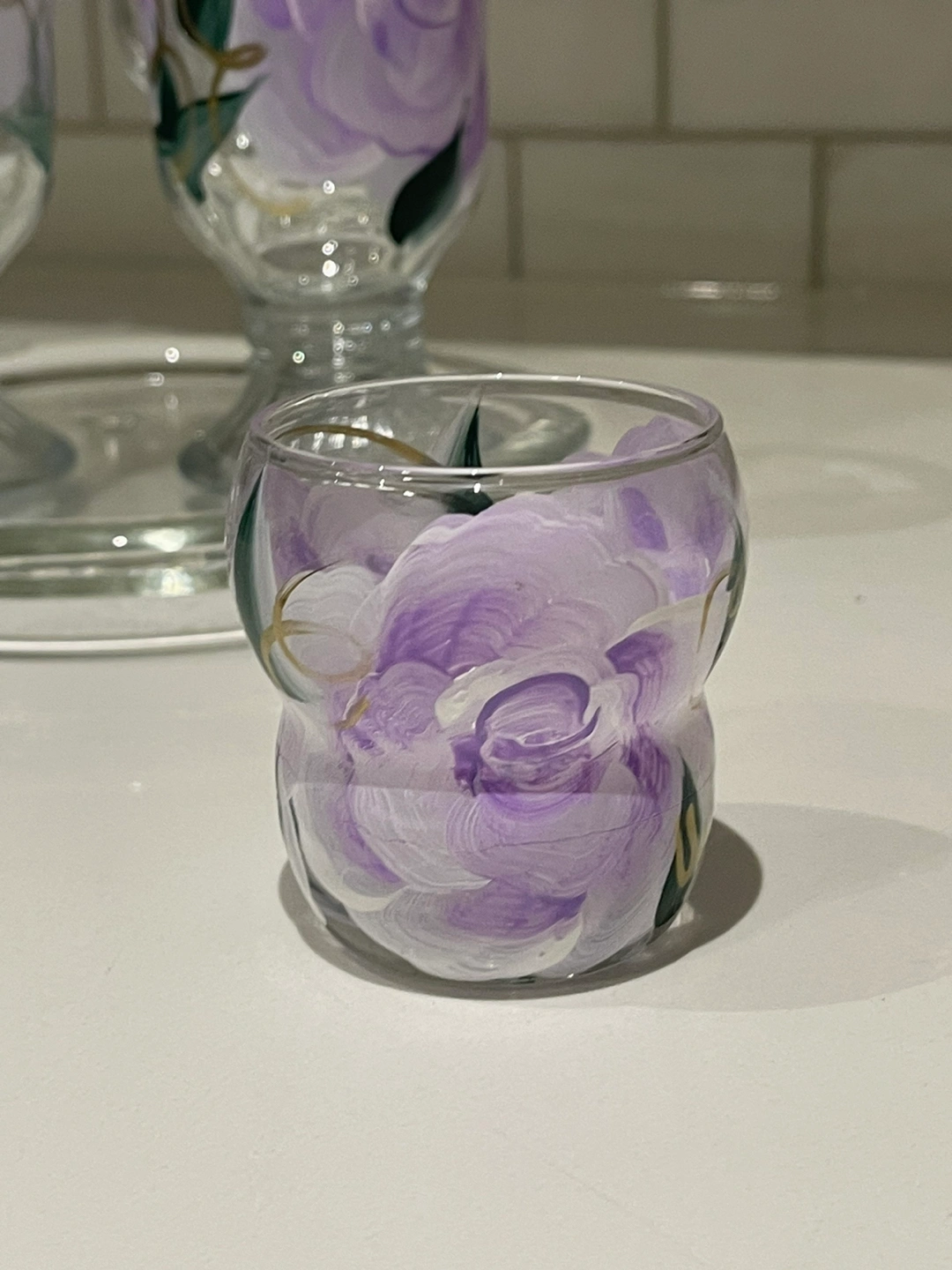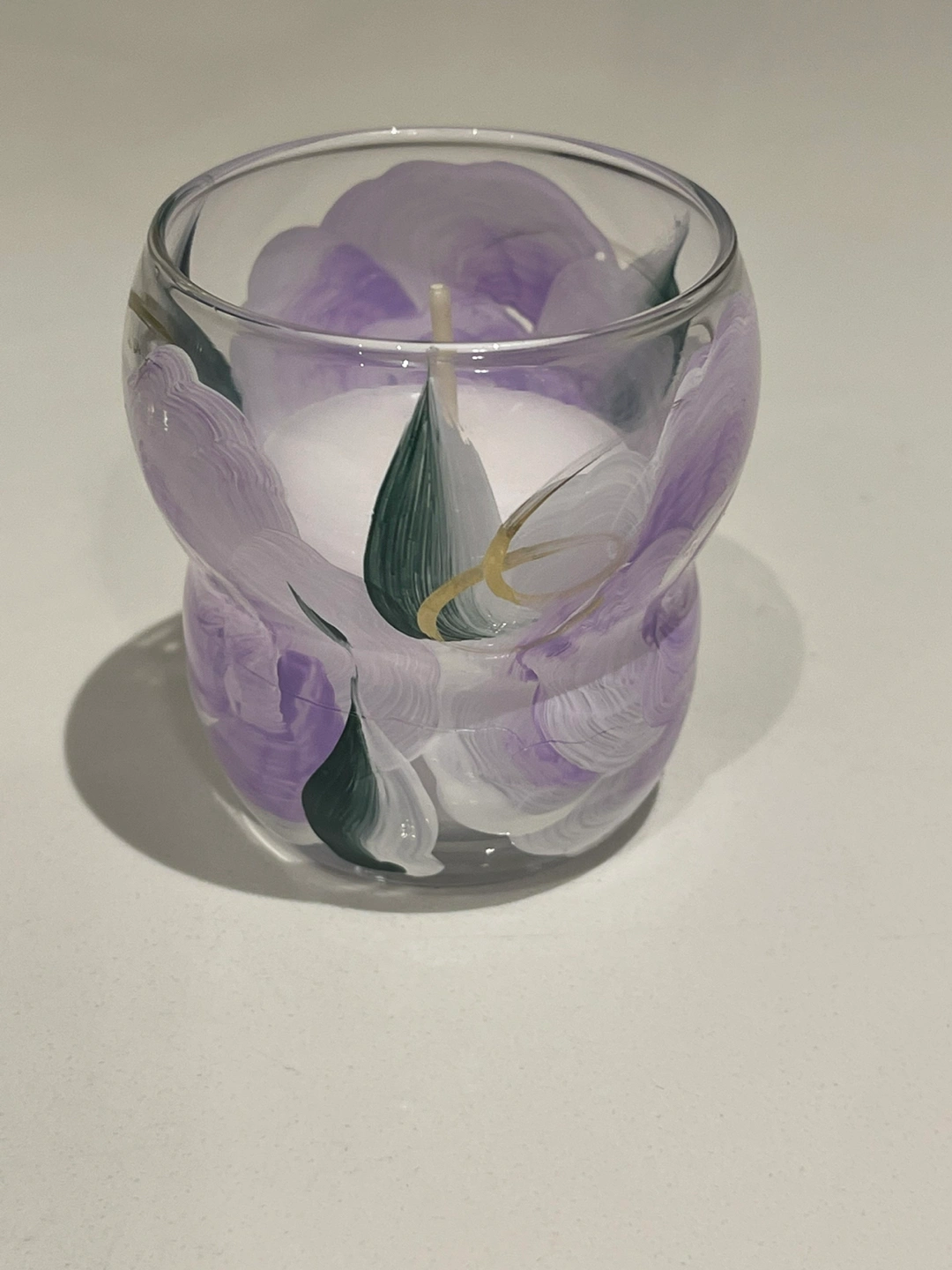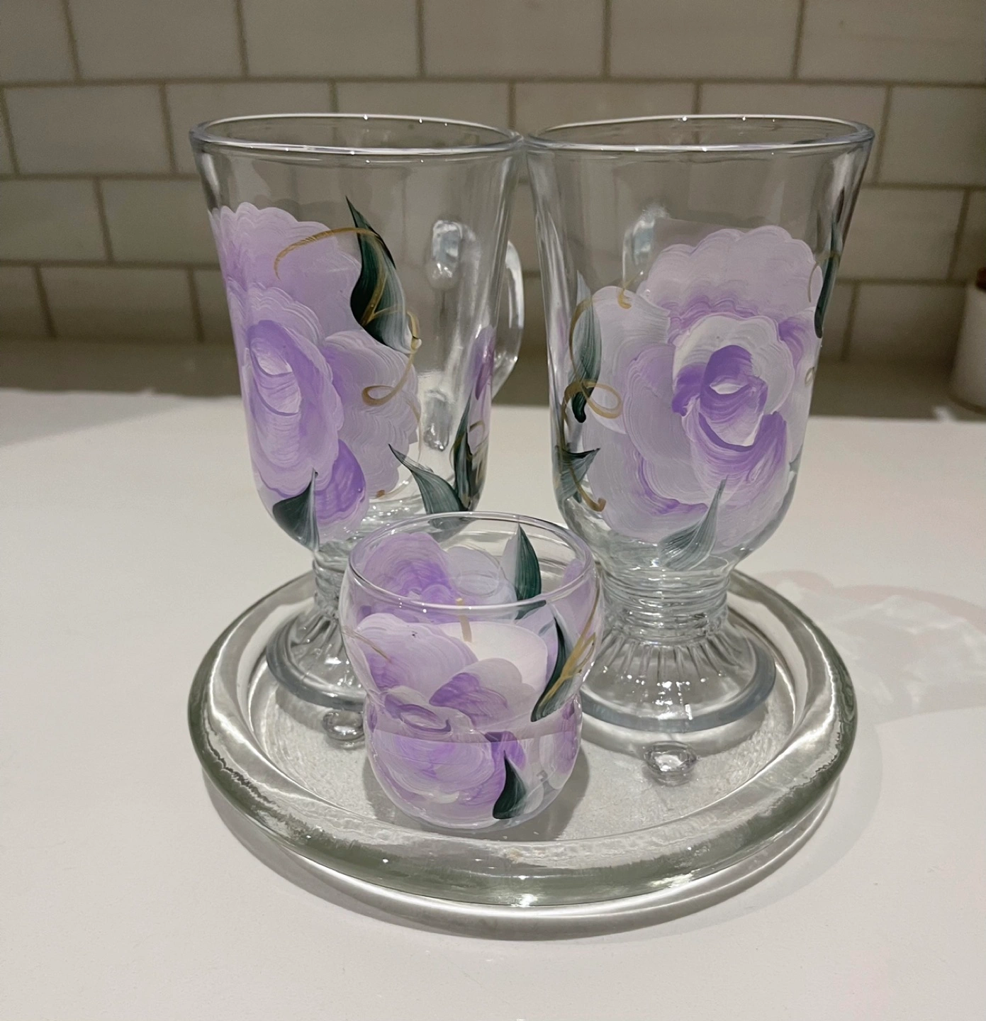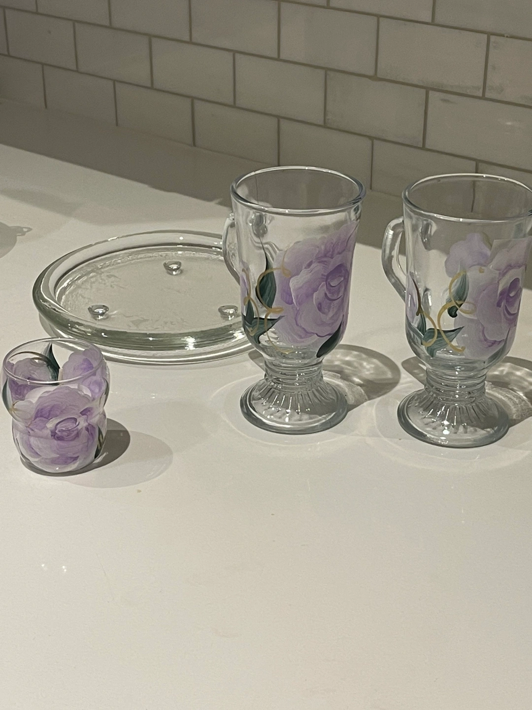 Hand painted by an artisan in Markham, Ontario. Glass gift set includes 2 coffee cups, a tea light holder, tray and candle . Hand wash only. Never used. No chips or damage . If wrapped in clear cellophane and topped with a bow this will make a beautiful hostess gift, great for a gift exchange as is or add gourmet tea or coffee and biscuits…. Really pretty gift idea! Trafalgar & Dundas Oakville area.
