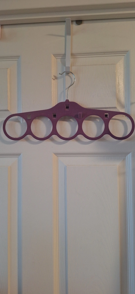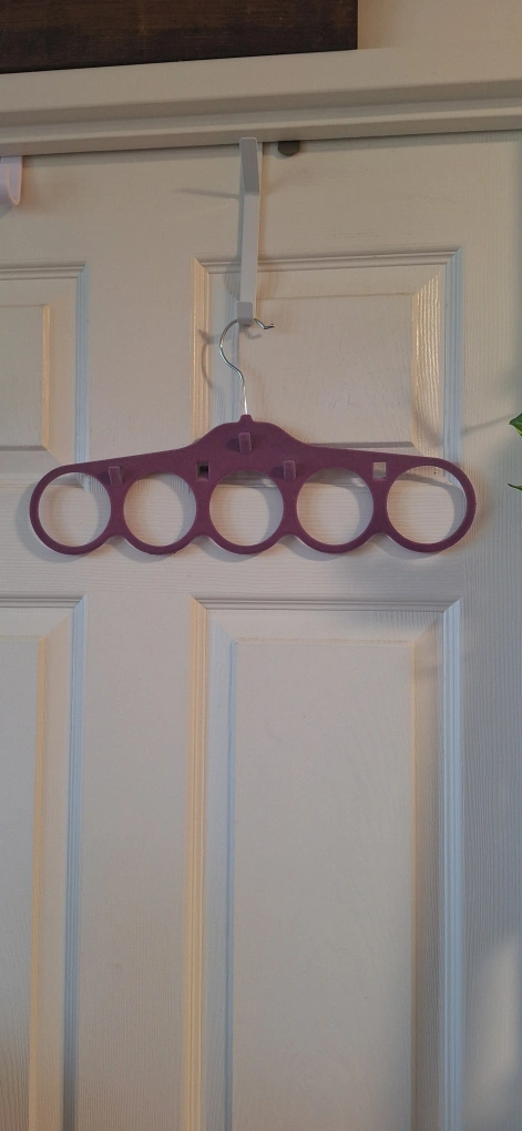 Very useful felt hanger has been used for scarves and belts. One tab (last pics- far left tab) missing. No longer needed.
