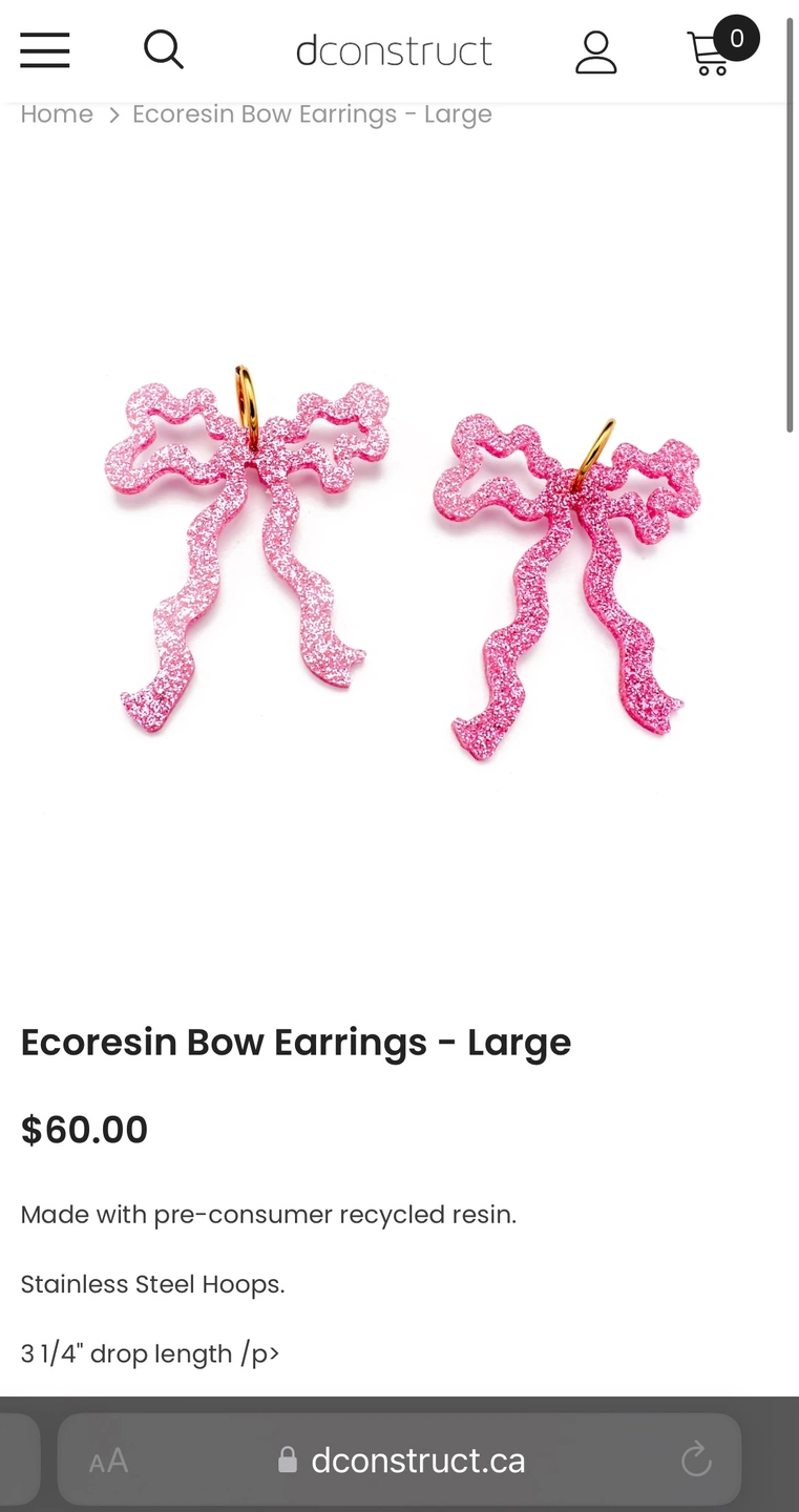 Brand new sparkly pink bow earrings from Winnipeg women-owned small biz. I bought these without realizing how big they are and they don’t suit my style. I paid $60 + tax + shipping. Comes with a white box – can be giftable. The third photo is taken from the brand’s insta. Just trying to recoup some of the costs. These earrings deserve to be worn and loved!