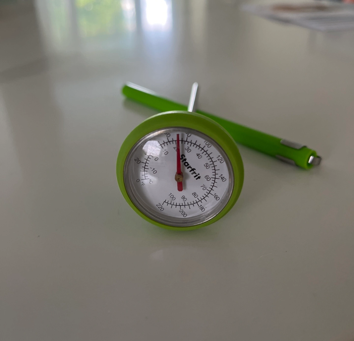 Green Starfrit thermometer to be used for cooking. Check the temps of your meats and other dishes. We were gifted another one so don’t need two.