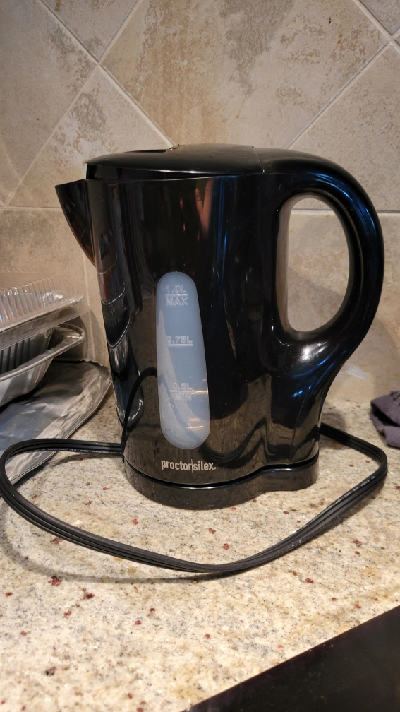 New black Proctor Silex Kettle. Plastic. Only used a few times. One liter capacity. Cord free serving.