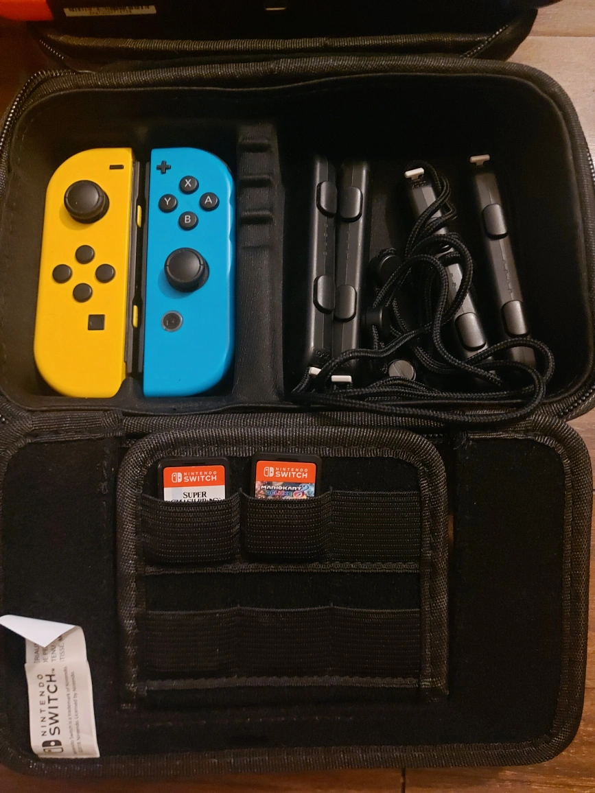 also comes with carry case and Mario Kart 8/Super Smash Bros.