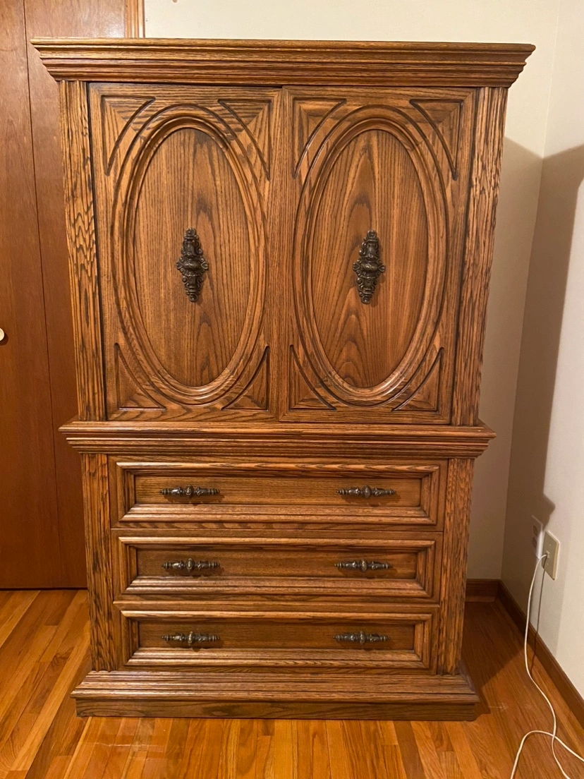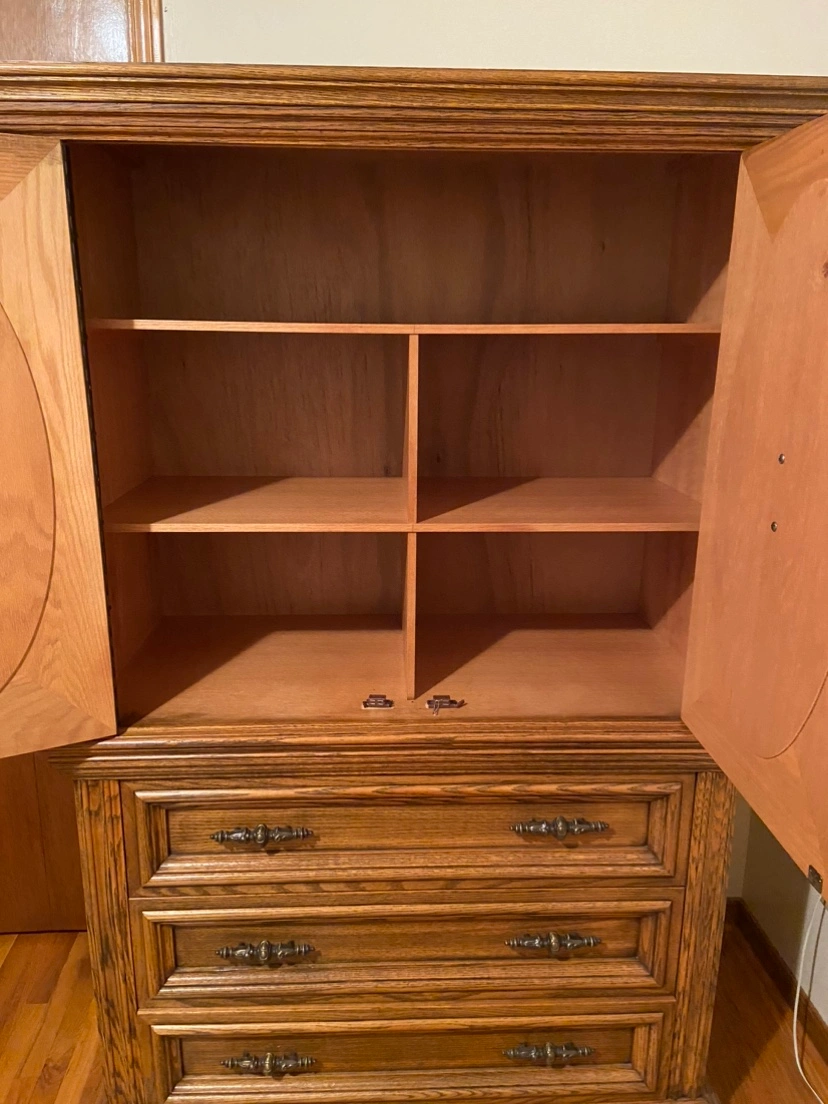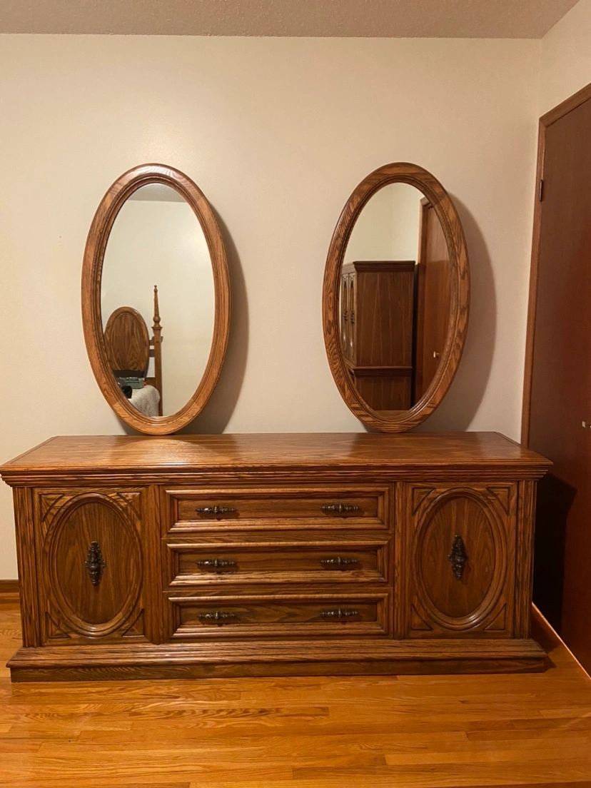 Wood bedroom set includes queen size bed frame, no mattress two end tables, tall boy with three pullout drawers, and two upper doors with shelving inside, and dresser drawer with two mirrors. Asking $400