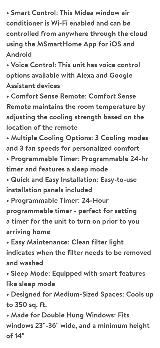Brand new in box Midea 8000 BTU Smart WiFi window Air conditioner Fits window openings 23-26" with minimum height 14" Smart WiFi can be controlled by your Smart phone iOS or Android Voice Control Remote 3 cooling modes 3 fan speeds Full description details in attached pics Retails at $325 plus tax