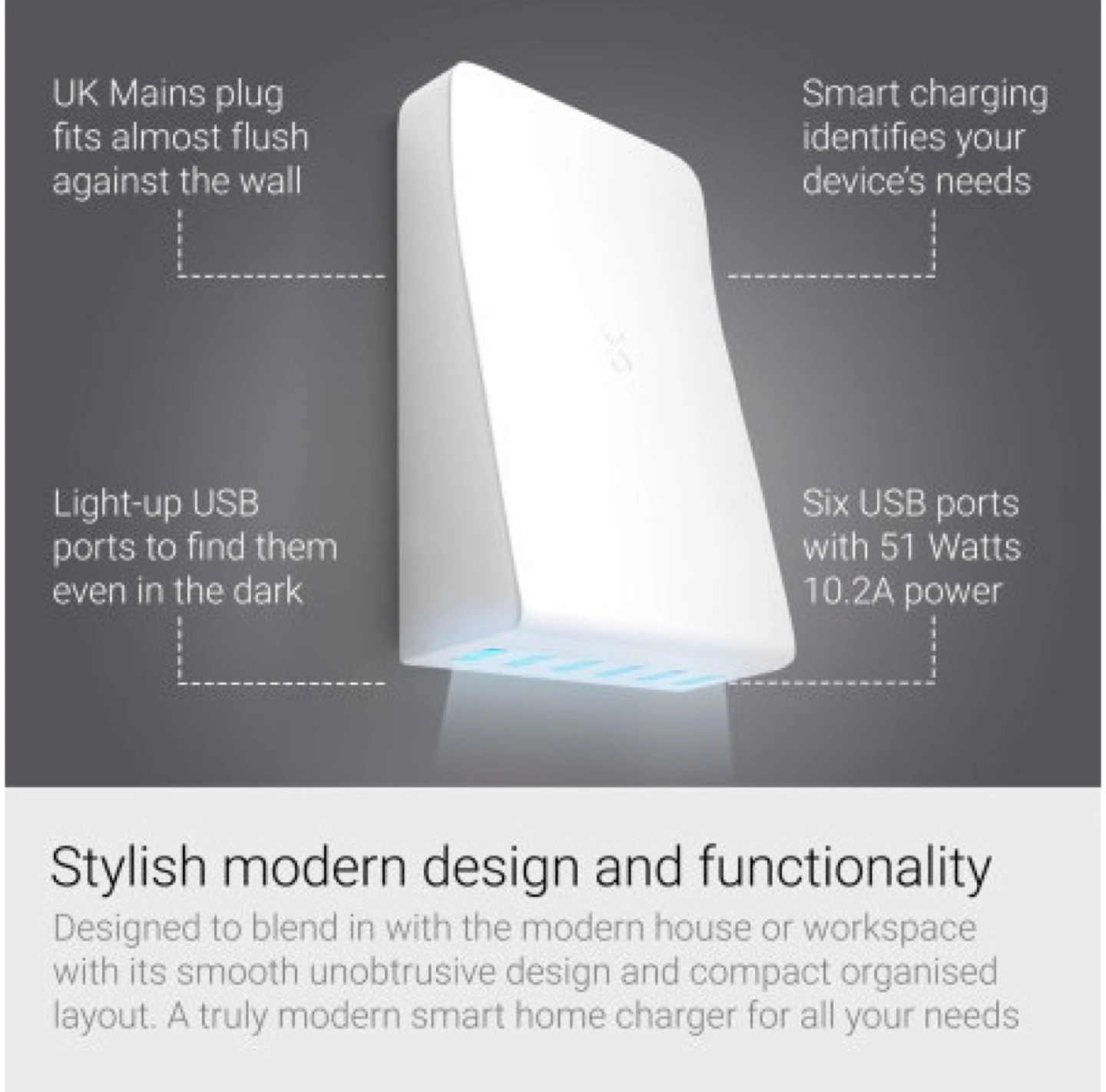 * Fast charge up to 6 devices with 51 watts / 10.2A total (2.4A, 2.1A, 1.0A)