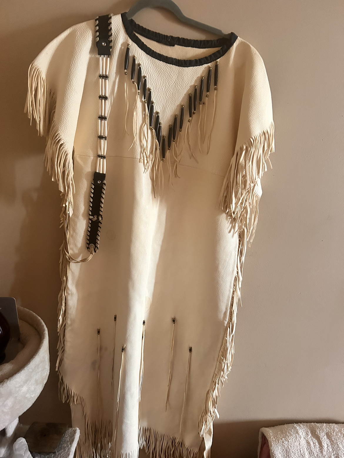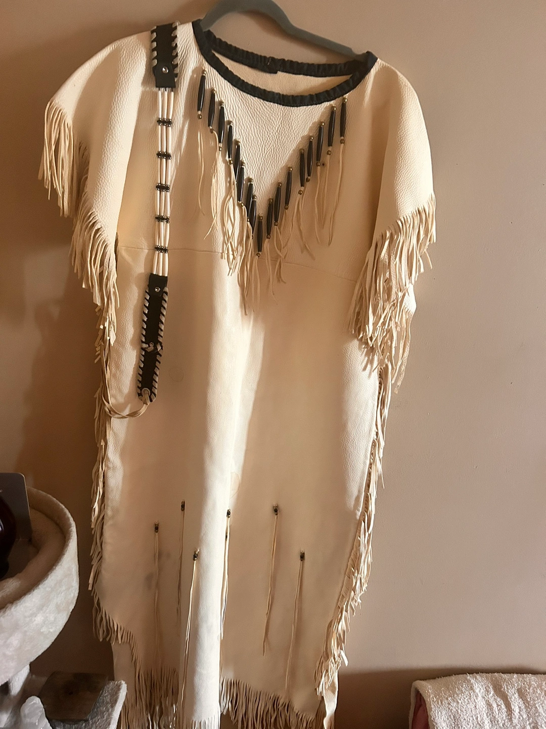 Hand crafter for a period movie. It is crafted from 2 white deer leather hides.