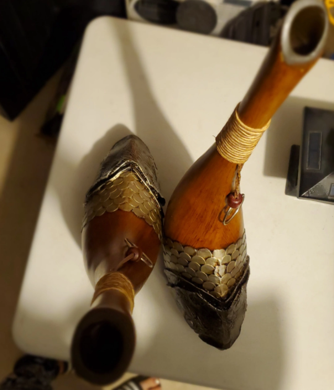 Made from hard good quality wood with smooth finishing glaze, features carved details, artistic metalwork, and rope & bead decoration.