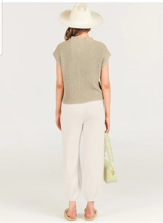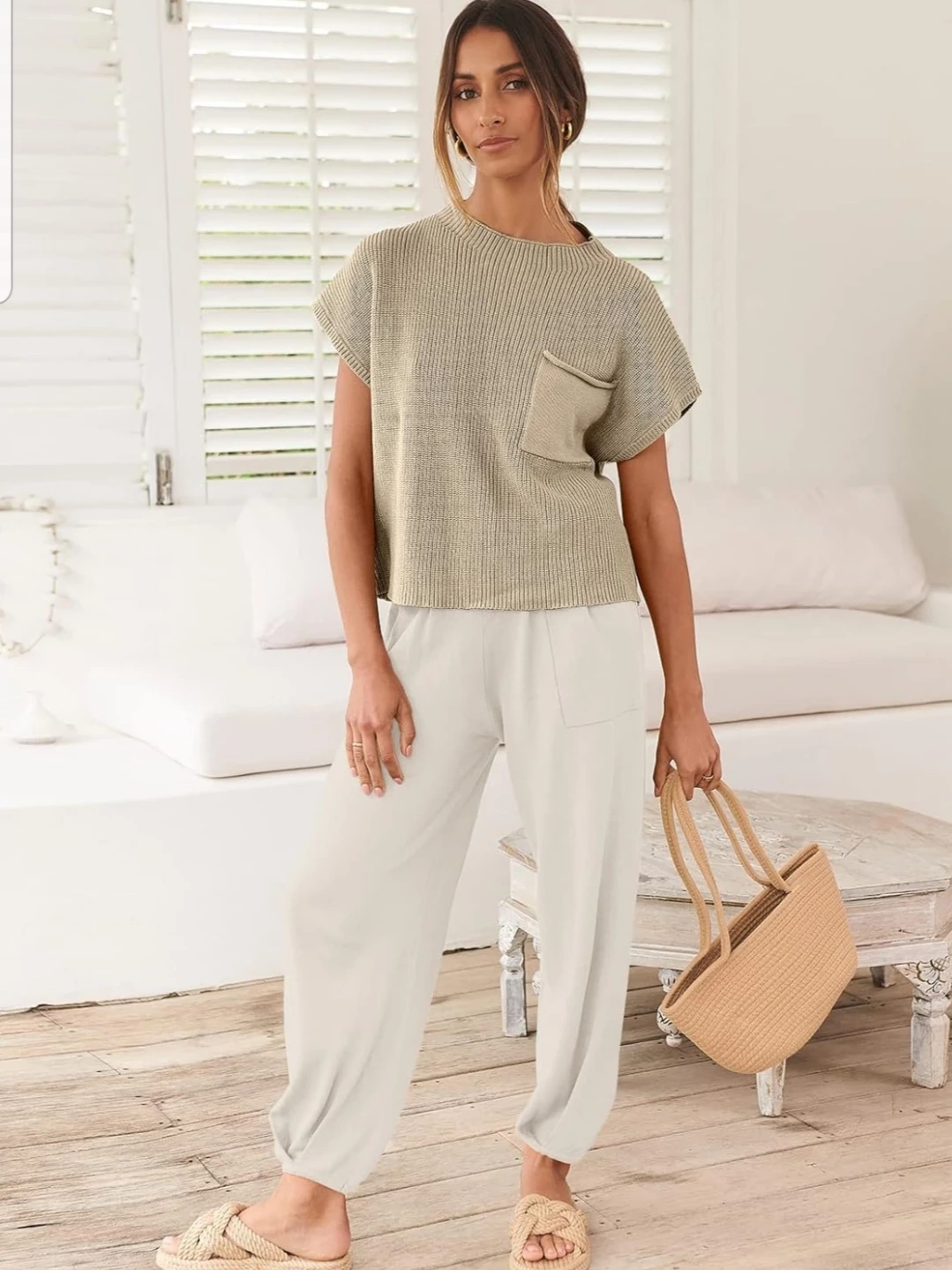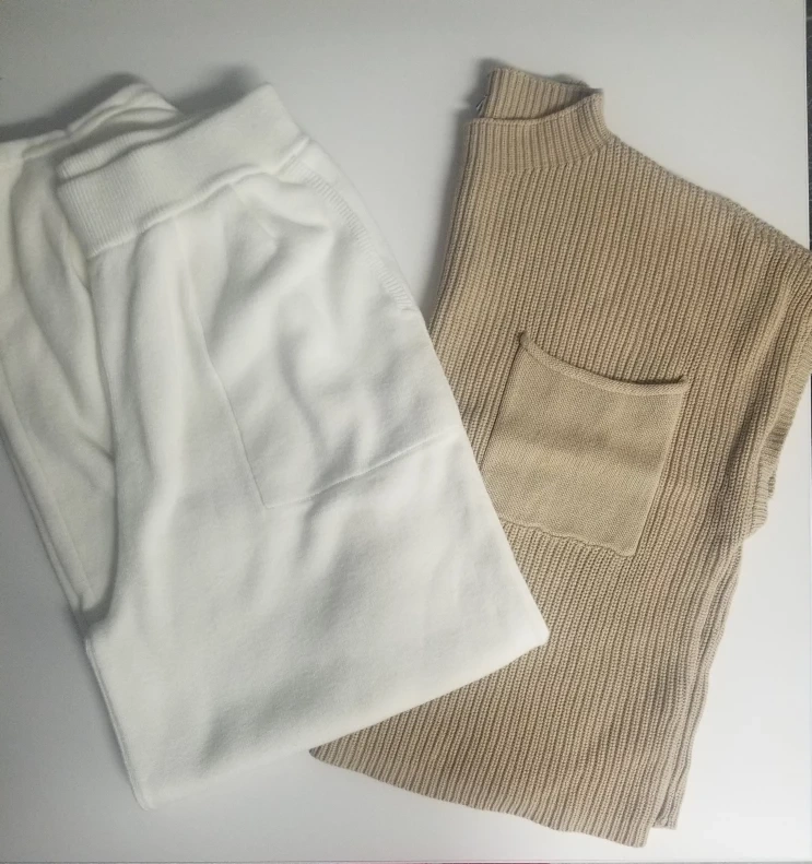Beige knit pullover sweater and white lounge pants.