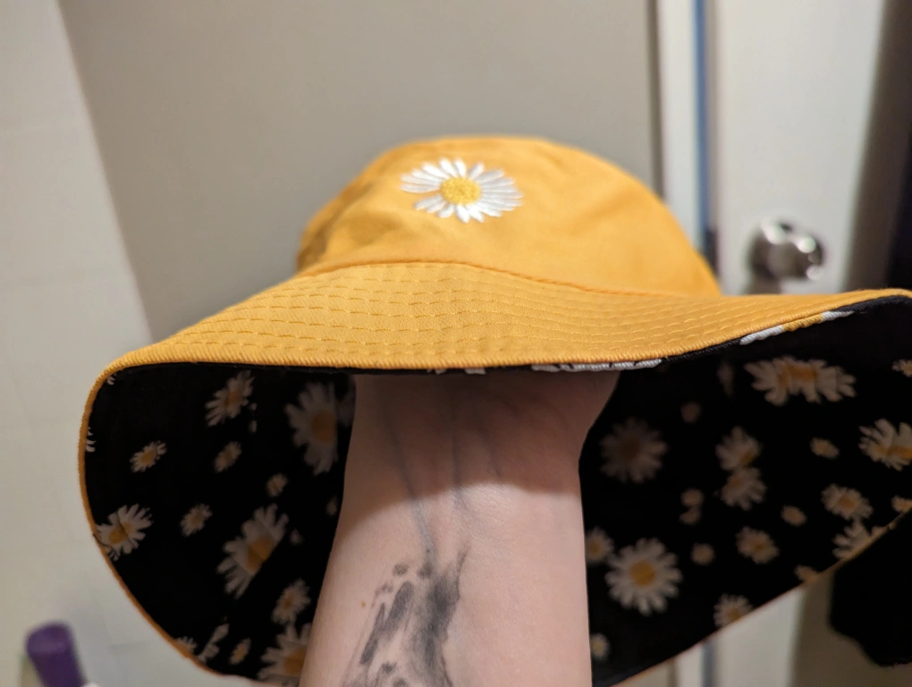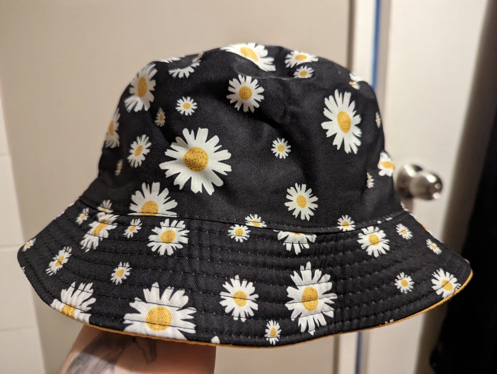 Reversible bucket hat with daisies. One embroidered daisy on the yellow side. All over daisy print on the black side.