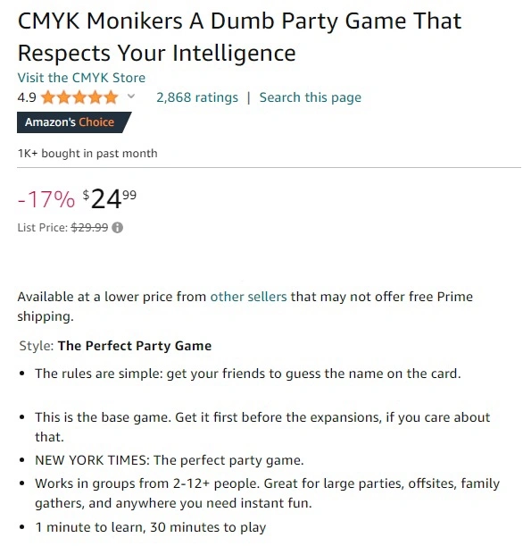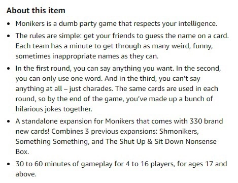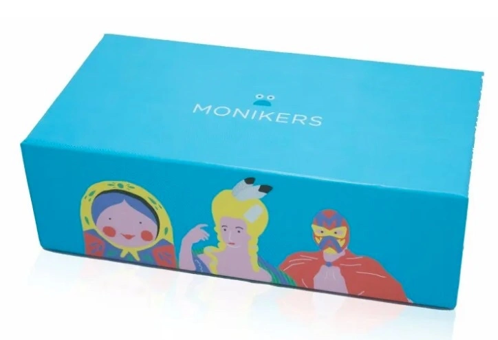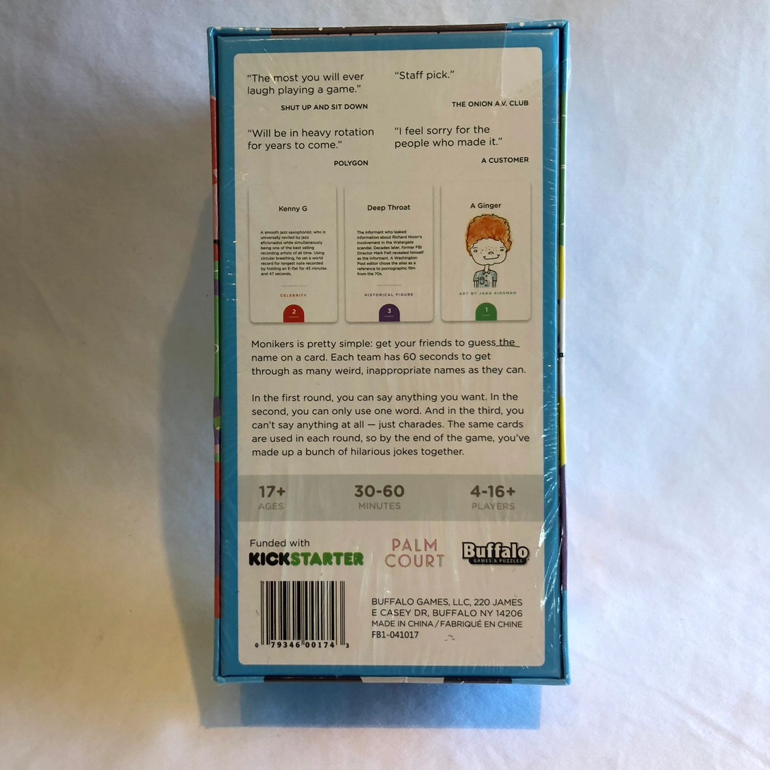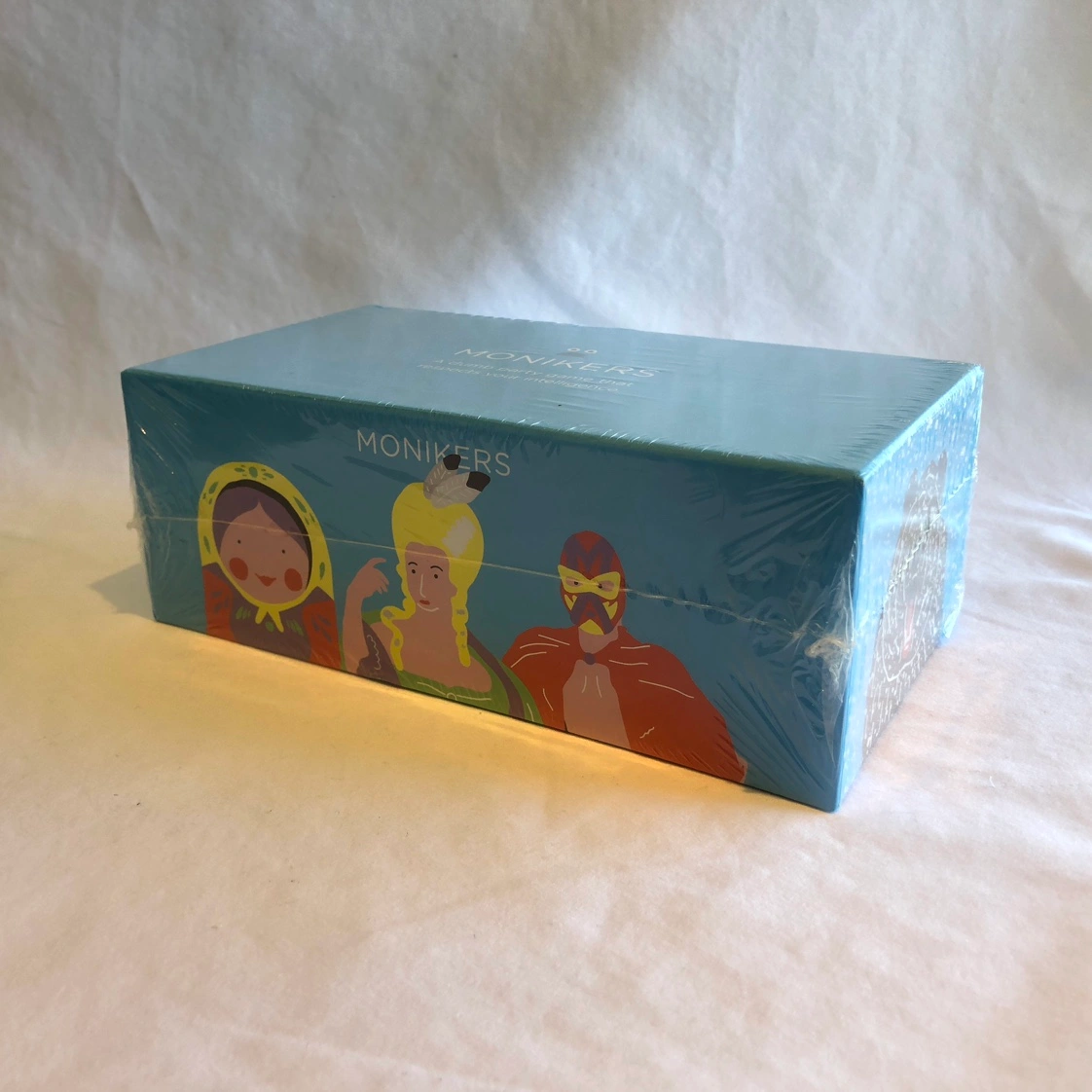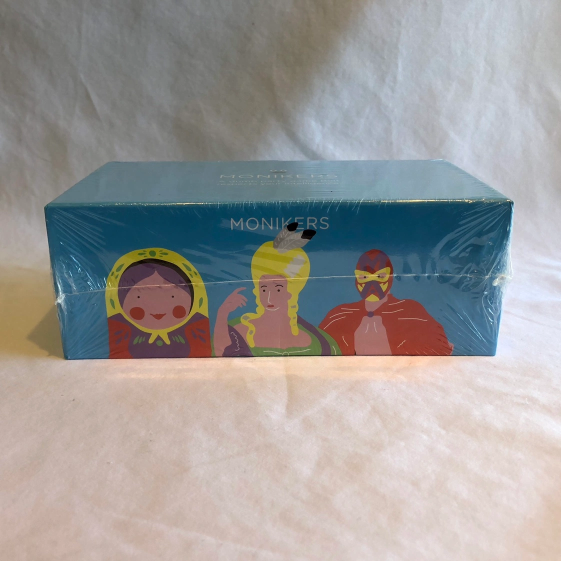 Plastic wrapped/New in box. The humorously illustrated party game Monikers, which was created by Alex Hague and Justin Vickers and is an updated version of the classic game Celebrity, is now available after a successful Kickstarter campaign.