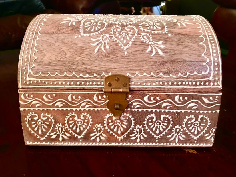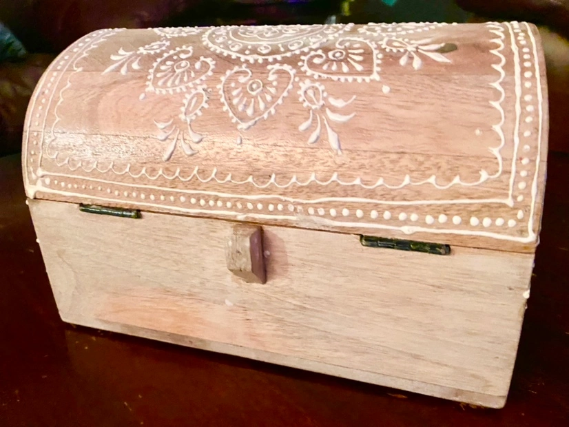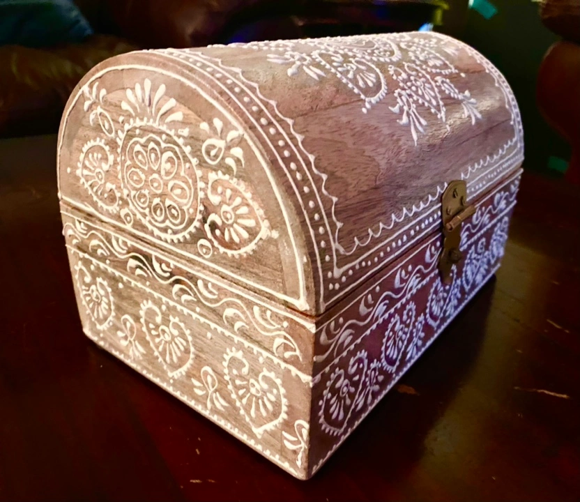 Made in India, beautiful wooden keepsake box with rounded top. Hand painted.
