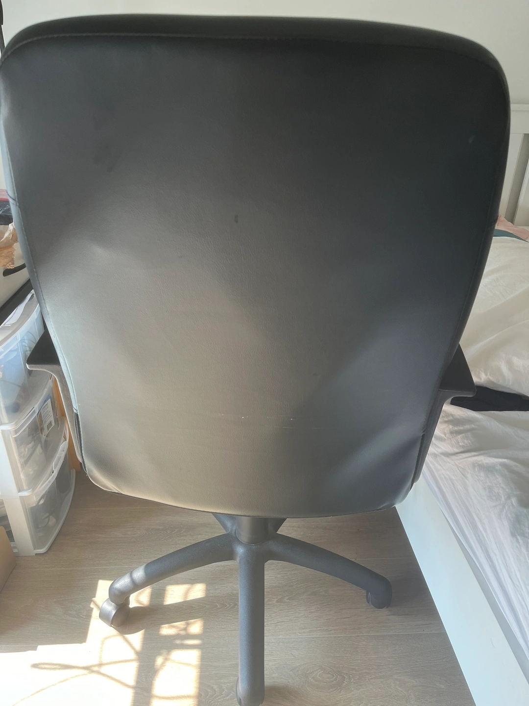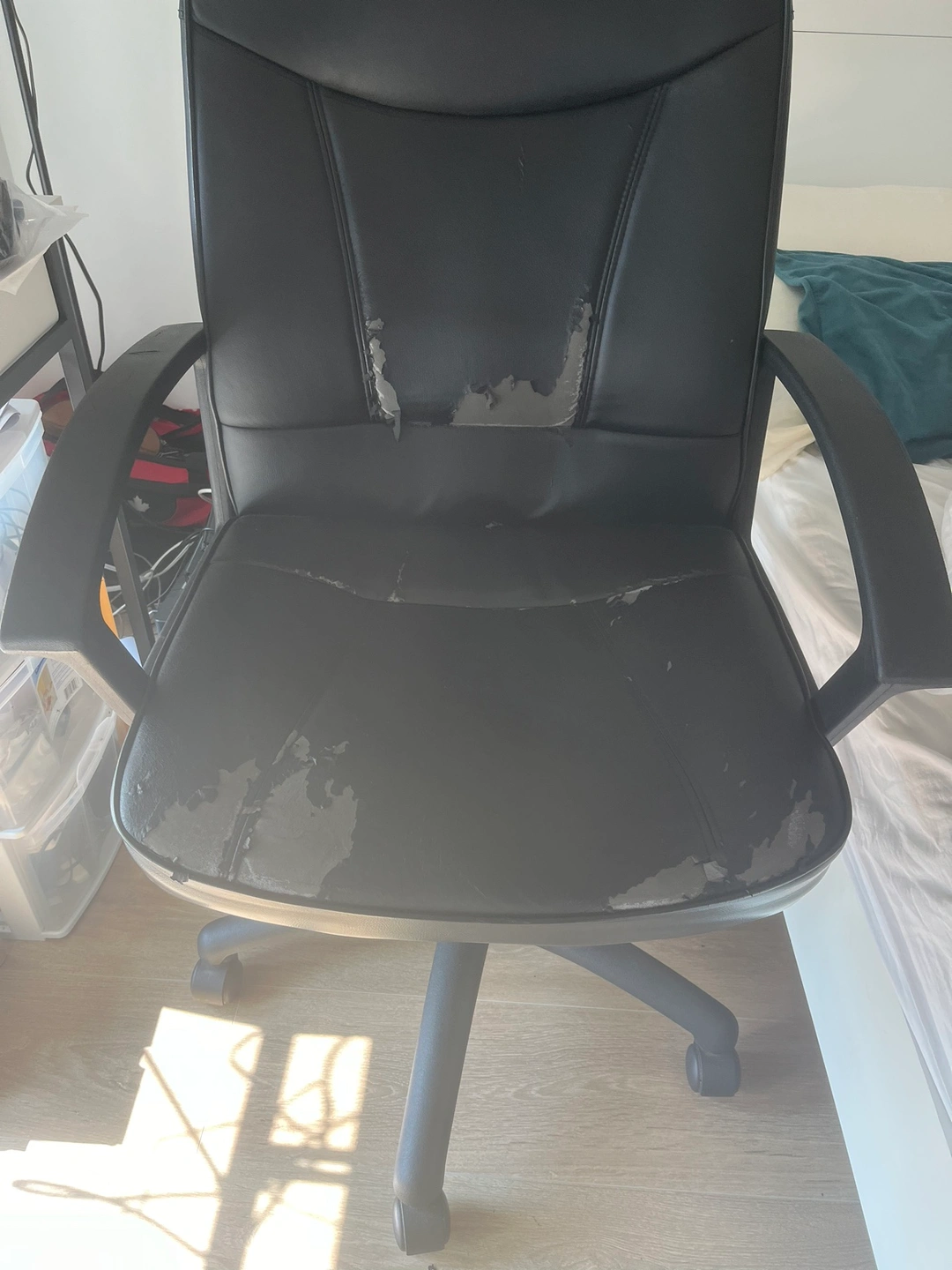 Black office chair perfectly functioning. As you can see, some flakes happening on the chair.