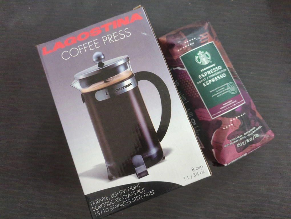 Coffee press is new in box, beans are sealed and have a August 6/2024 date.