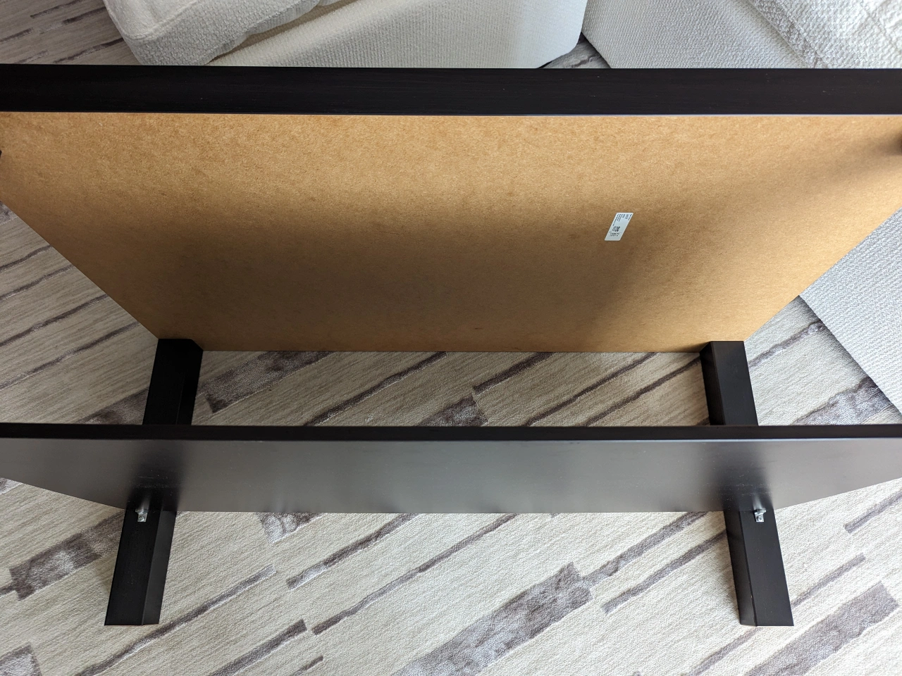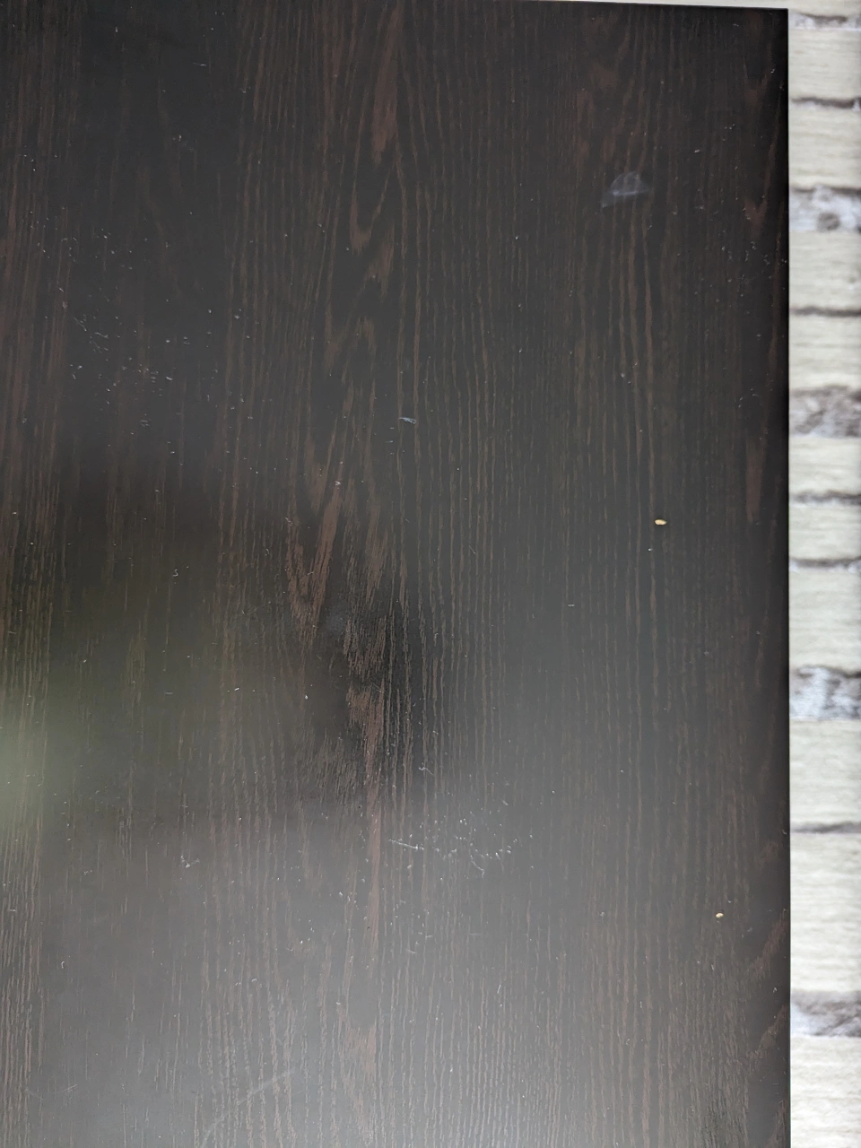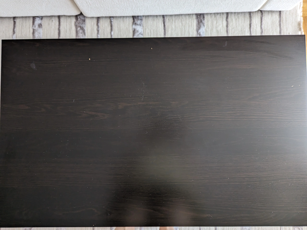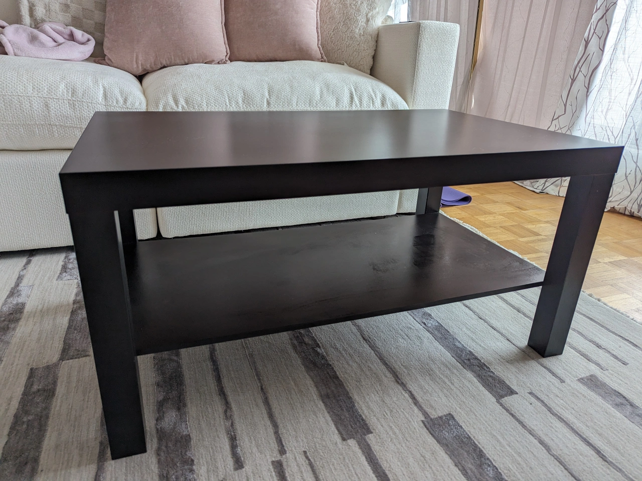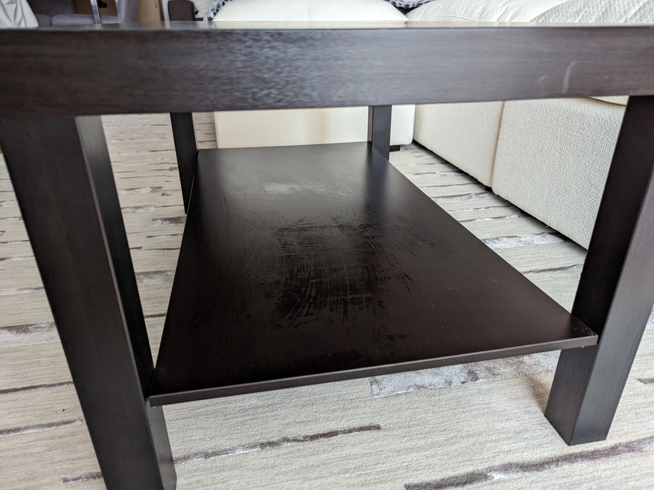 Coffee table is in good condition. It has some tiny chips on the top and edges. it is NOT broken at all and as you can see the bottom is in good condition too. It looks a bit shiny because I wiped it down prior to taking pics. See pic for specific dimensions.