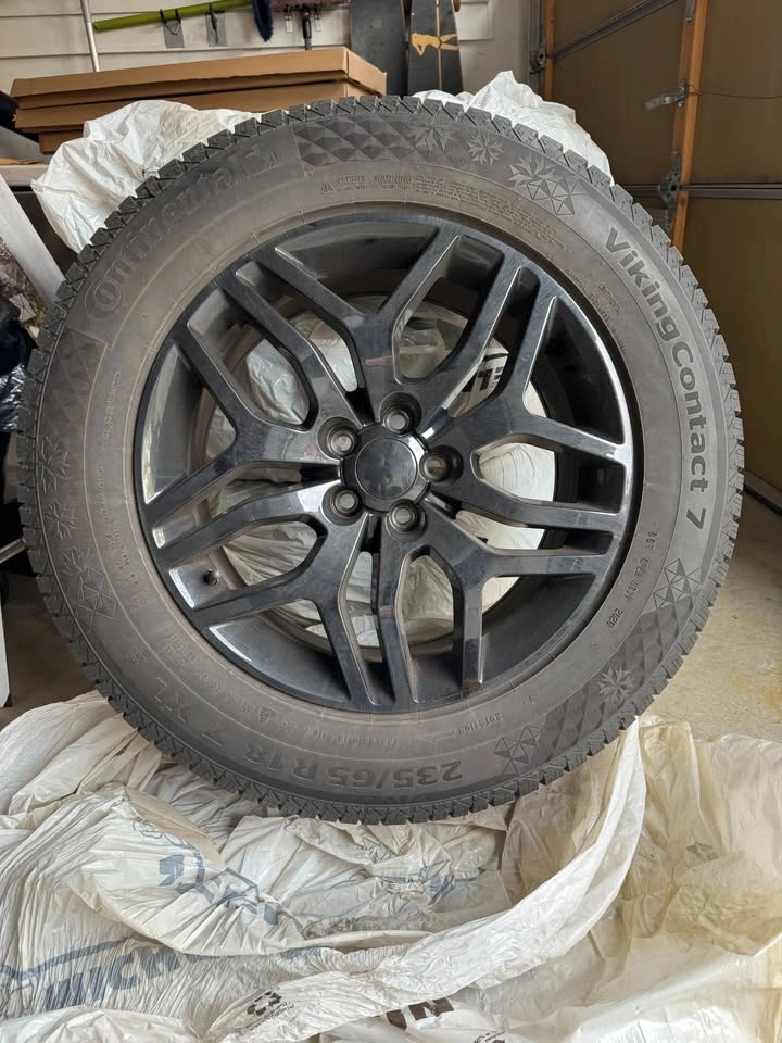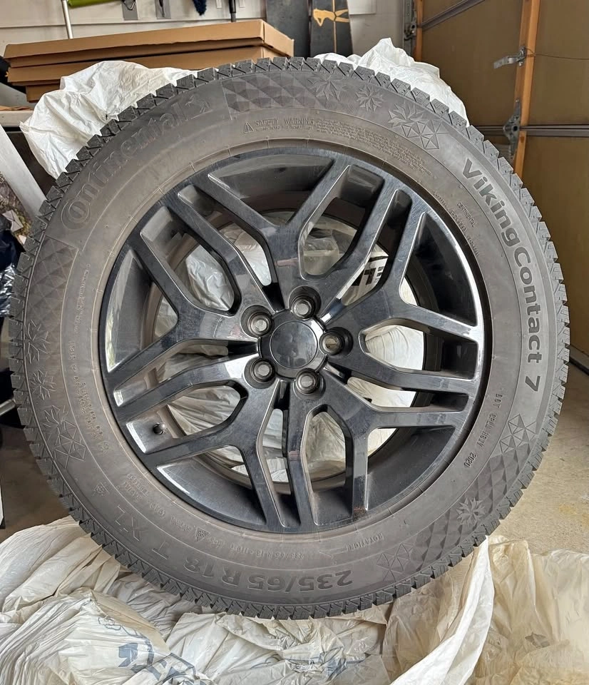 60MINT CONDITION set of 4 winter tires and alloy rims with TPMS - came off a 2018 Jaguar F-Pace. - 235/65 R18 Continental VikingContact 7 winter tires - About 85% tread left - DOT 2020 - 5x108 gloss black alloy rims - Balanced and ready to go One of the best winter tire sets on the market! Fits Jaguar F-Pace models up to 2026 (P250 / P340 / P400), and may also fit other vehicles with a 5x108 bolt pattern (Land Rover, Ford, Volvo, etc.) Cash only. Pick up in Maple/Richmond Hill.