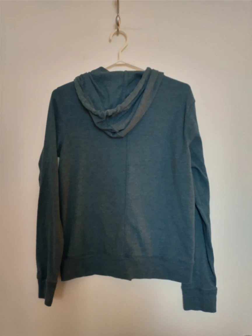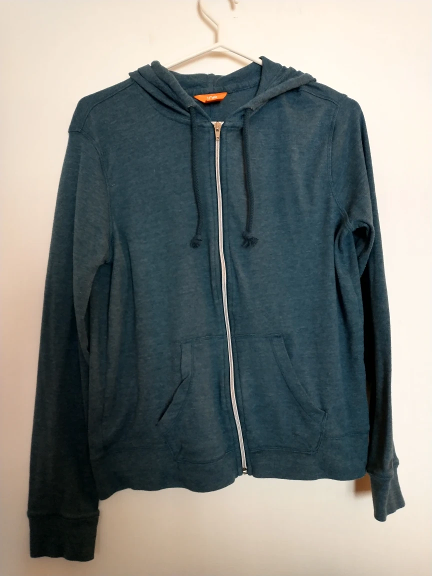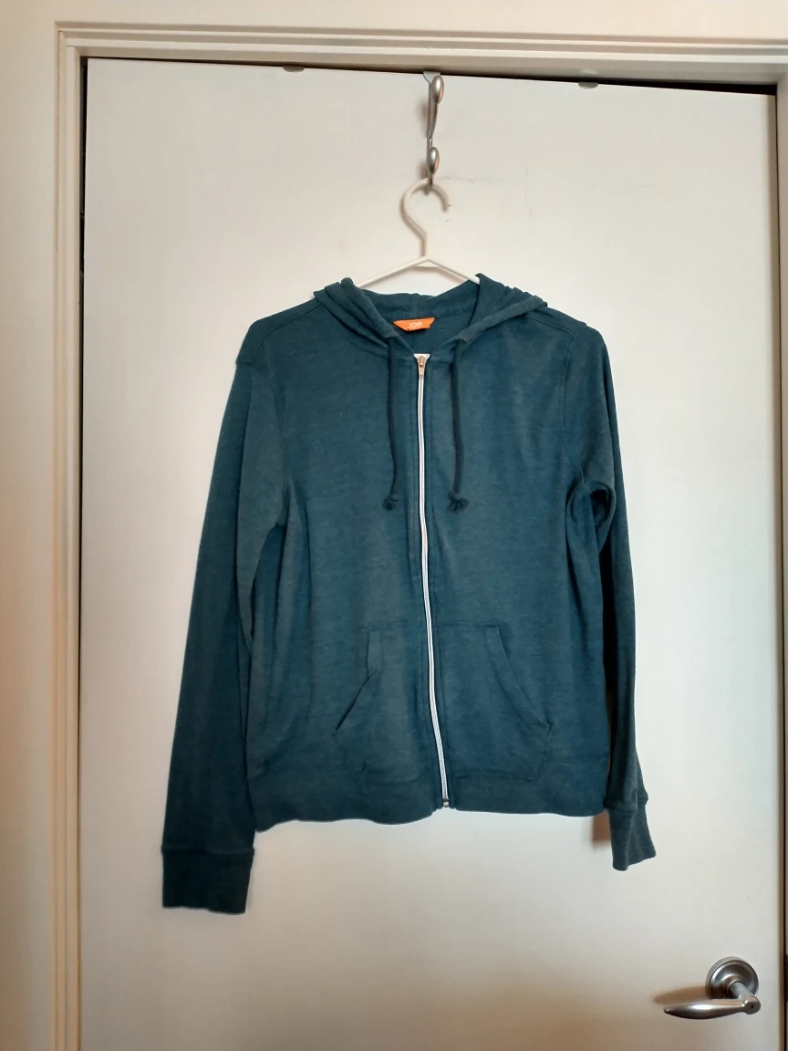 Lightweight Joe Fresh turquoise hoodie with zipper and front pockets. Excellent used condition. Only worn a few times. No holes, rips, or visible signs of wear. Great for spring!