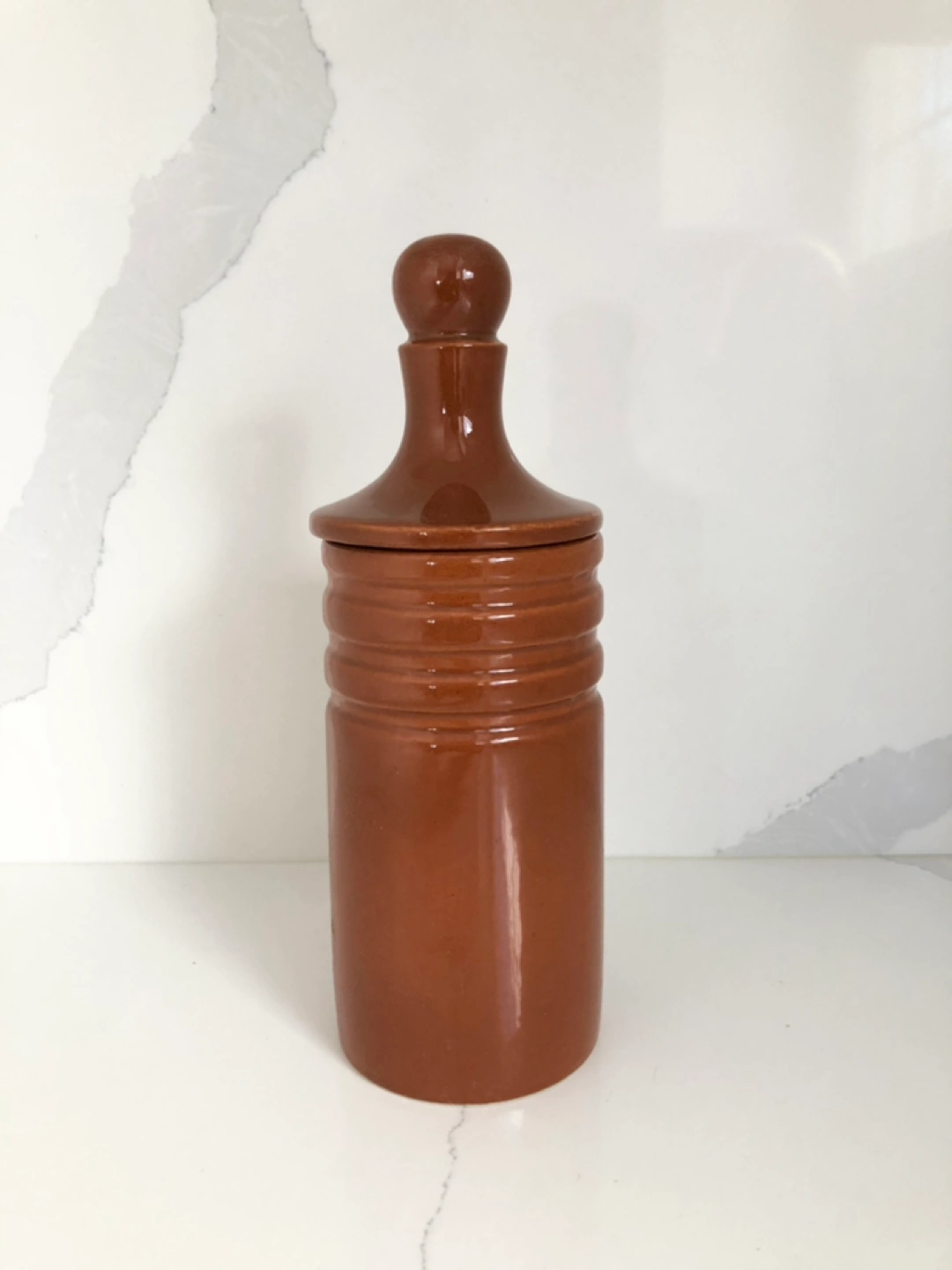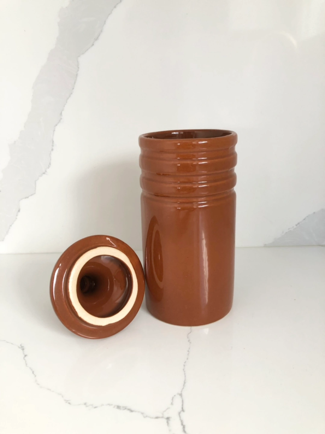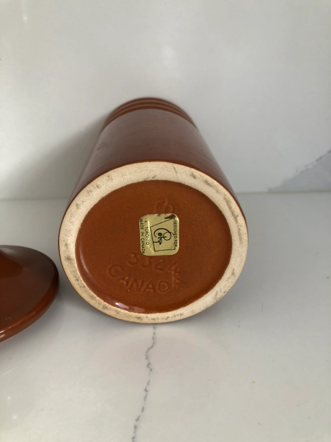 Made in Canada, brown decorative canister can be used to store items or not. Has a lid to keep contents dust free.