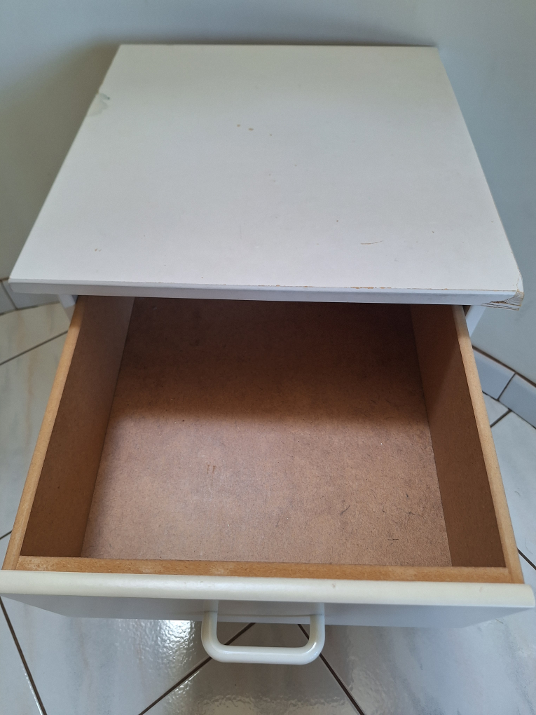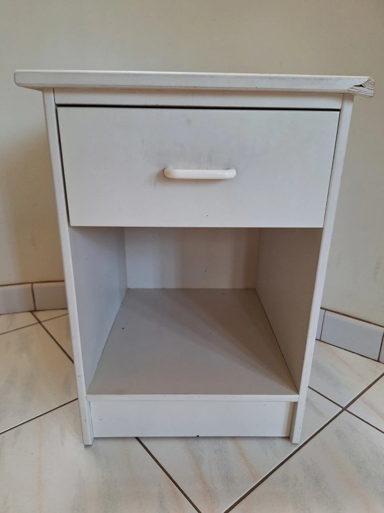 A nightstand we no longer use. Some damage to one corner and on the top, otherwise very sturdy and still useful!