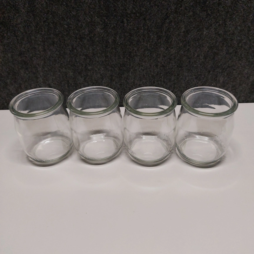 Yogurt jars (4) from the Maison Riviera "petit pots". They've been washed but there may be a tiny bit of adhesive residue on the lip.