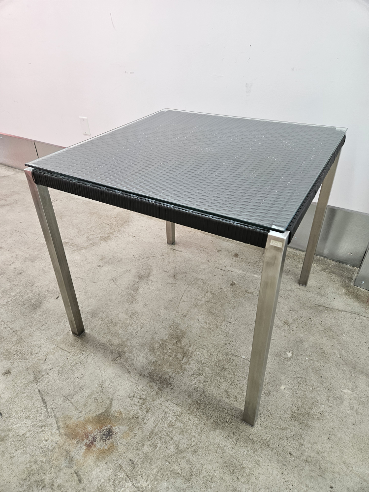 Legs are metal, weaving is durable plastic, and glass topper is 1/4 " thick.