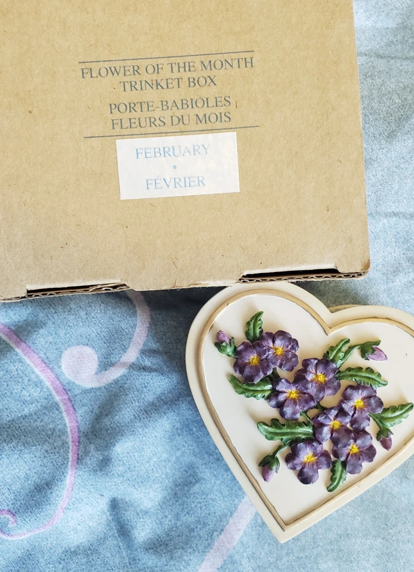 This lovely keepsake box is hand painted and crafted from polyresine and personalized with the flower of the month February Thanks