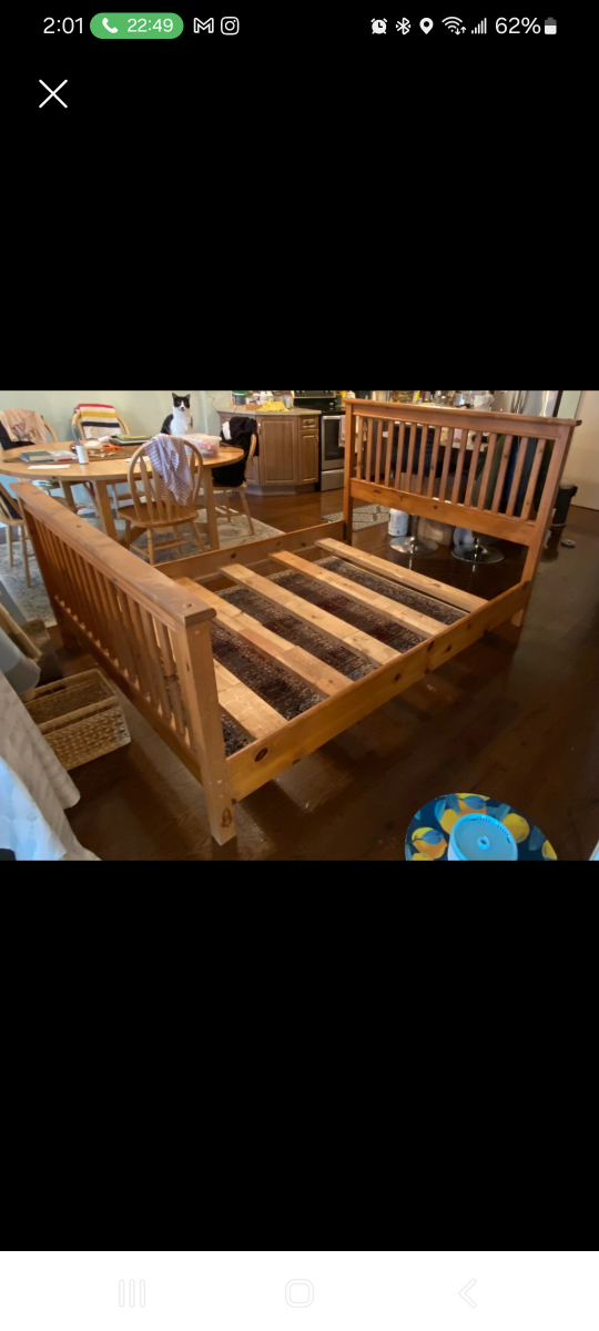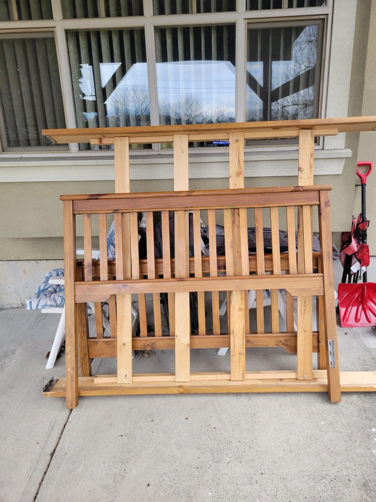 Solid oak bedframe, Queen size. Dismantled for easy transport. Has been stored out of the elements, so it's free of any weather damage. In really good shape, I'm just down-sizing to a double. Free, but must be able to pick up 😊