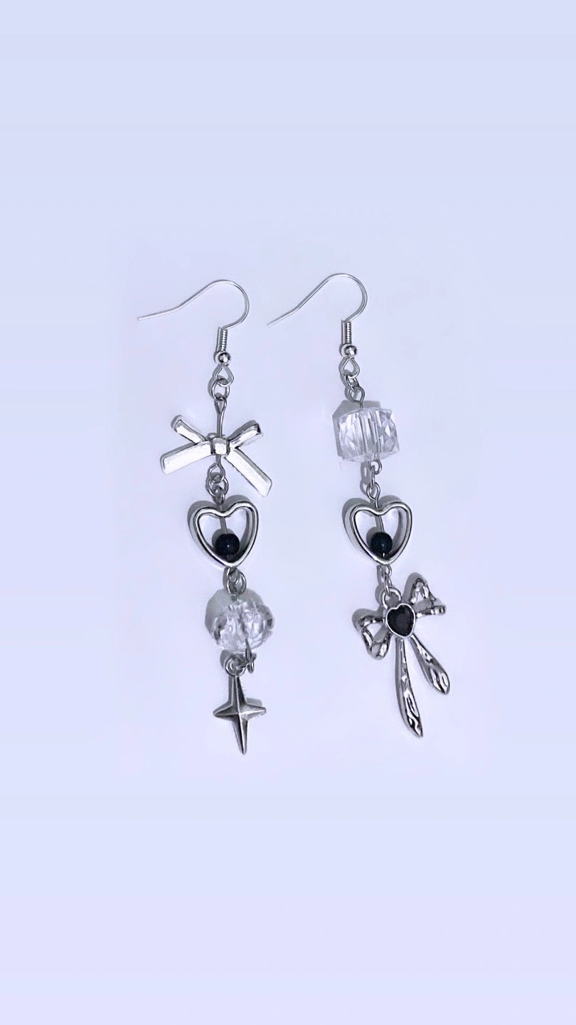 Asymmetrical Black Heart + Ribbon Bow Earrings (Handmade)