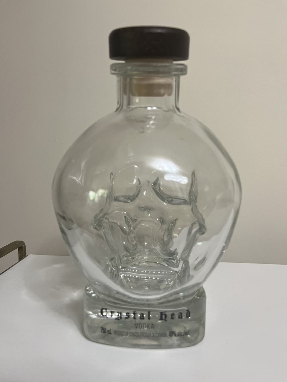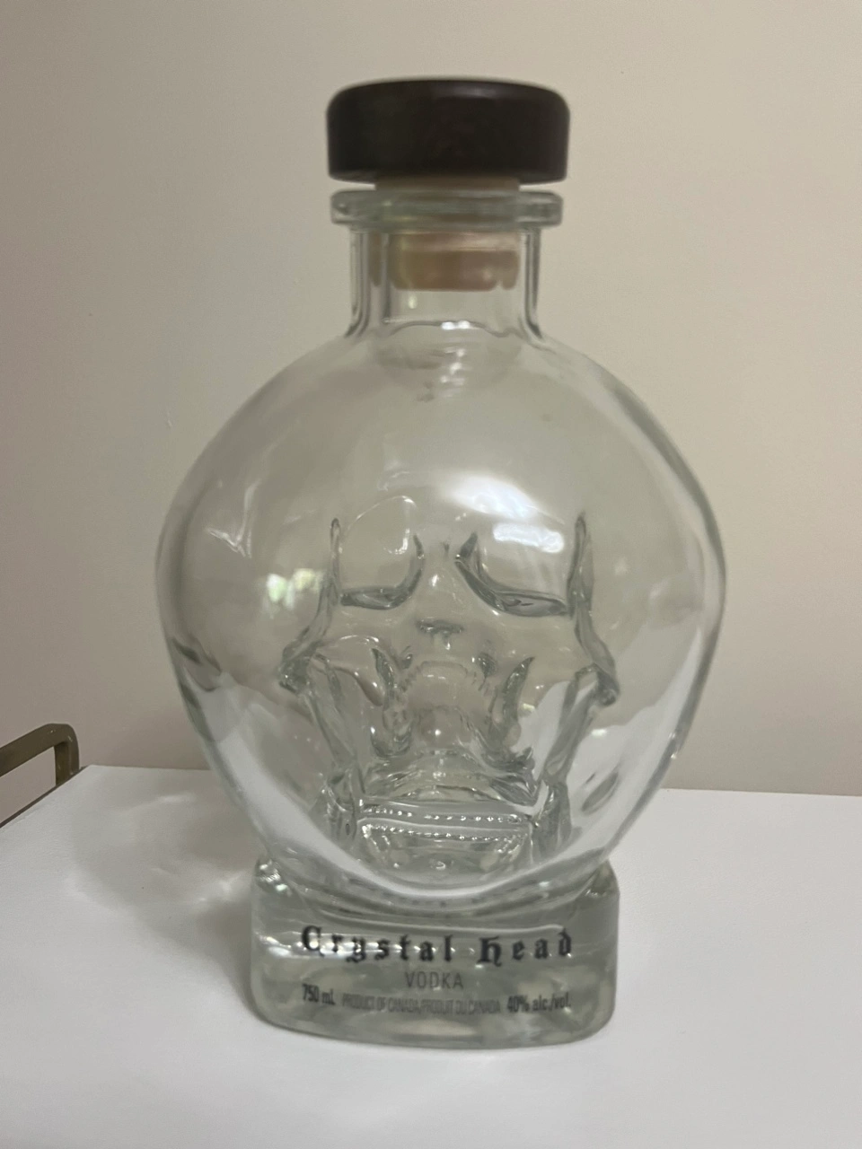 #freecycle Pick up Keele and Rogers Fun for decore or crafting EMPTY CRYSTAL HEAD SKULL SHAPED GLASS BOTTLE WITH CORK GREAT TO DECORATE YOR BAR OR USE TO DECANT YOUR FAVOURITE DRINK DOES NOT INCLUDE VODKA 750 ML The Crystal Head bottle was designed with the creative spirit in mind by creative people. Dan Aykroyd and John Alexander designed the iconic skull-shaped bottle as a symbol of life, reflecting power and enlightenment, only the best to hold their multi-award-winning spirit.
