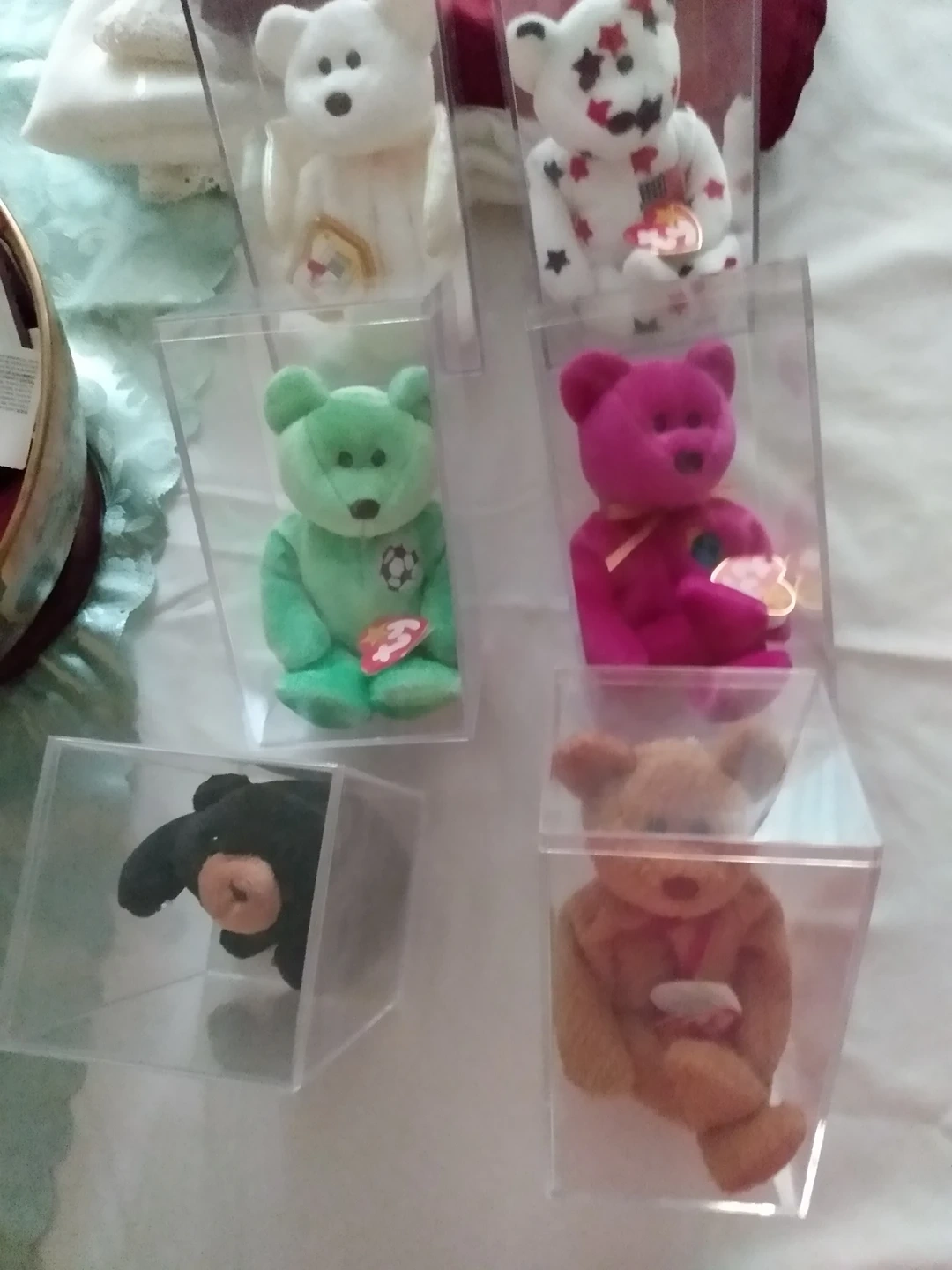 6 Special Ty Beanie bears that unfortunately has loose tags. Tag holders dried up. Selling all 6 for $80, or $15. each.