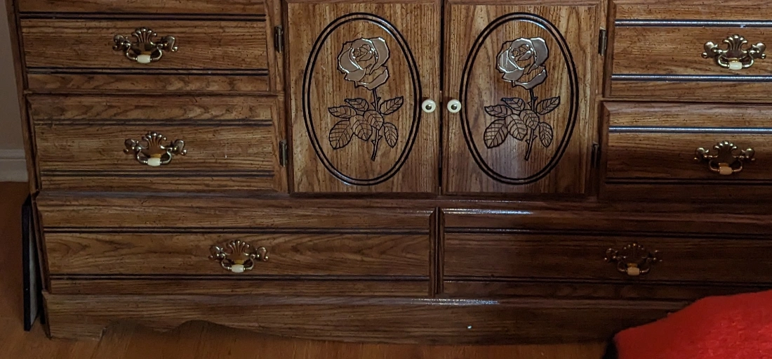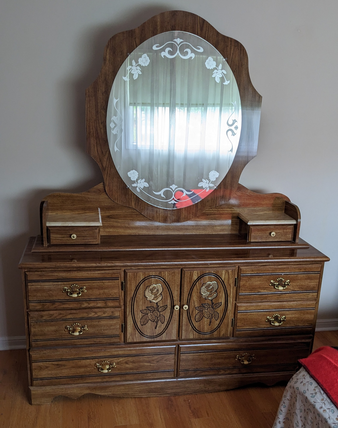 The mirror with two small drawers is a separate unit from the dresser, so you can put it elsewhere as needed. Gorgeous dresser has lovely gold rose embellishments on the wood and etched in the mirror. Perfect for a growing girl or someone who likes pretty furniture. Pre-loved and well taken care of. May have negligible imperfections due to use, but overall still looks very good.