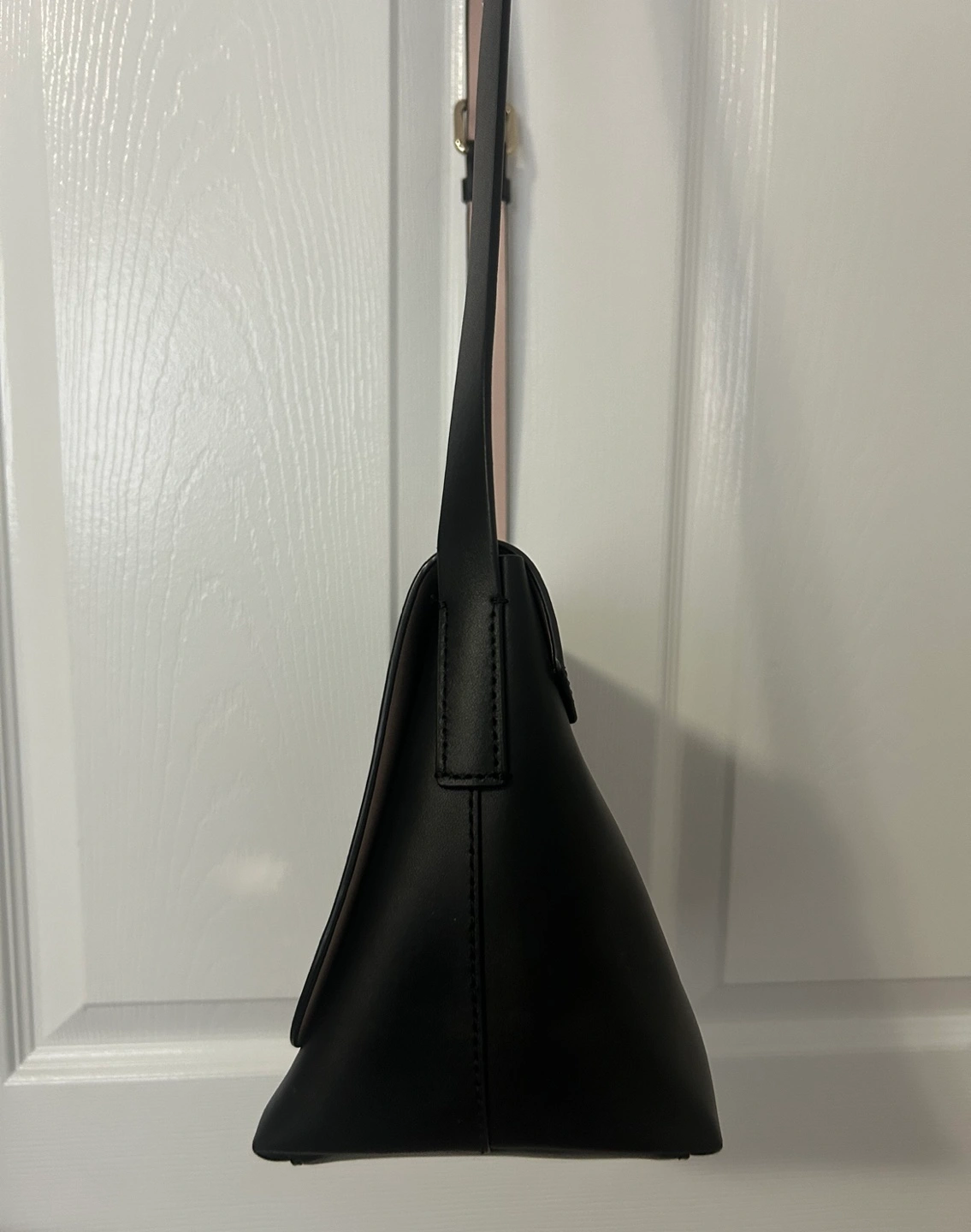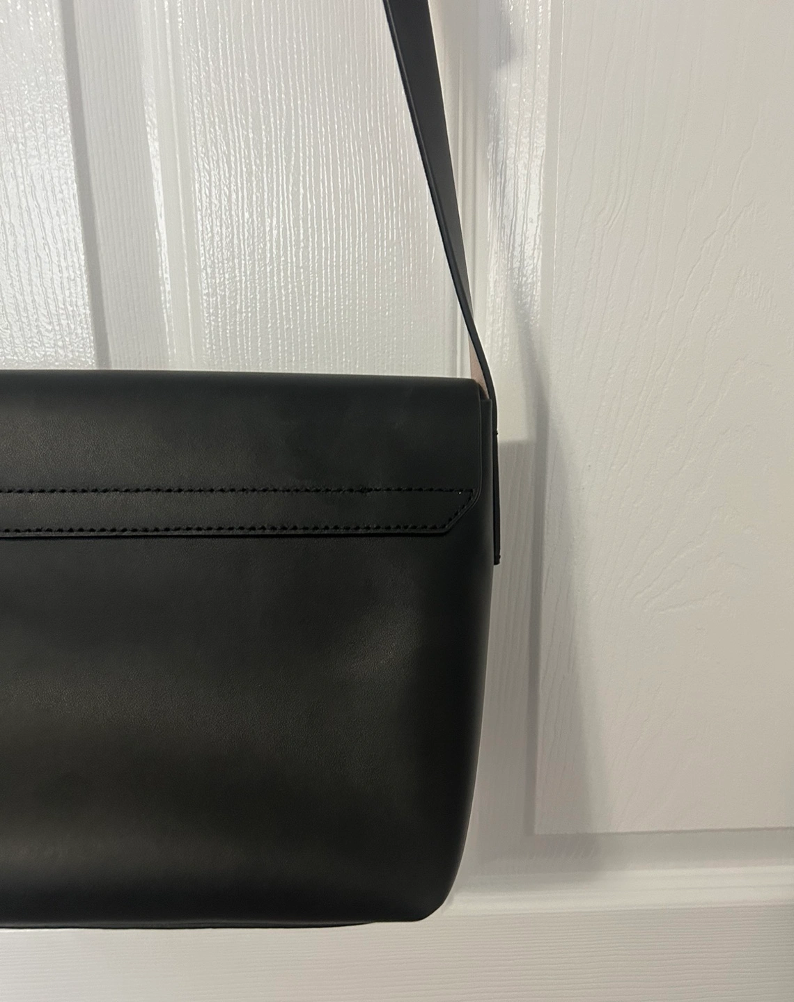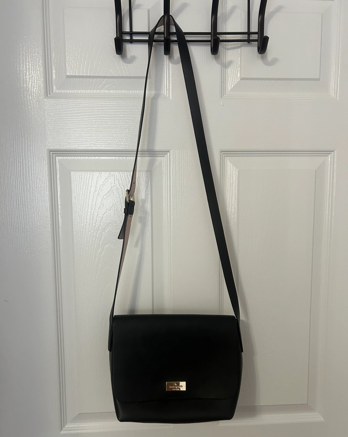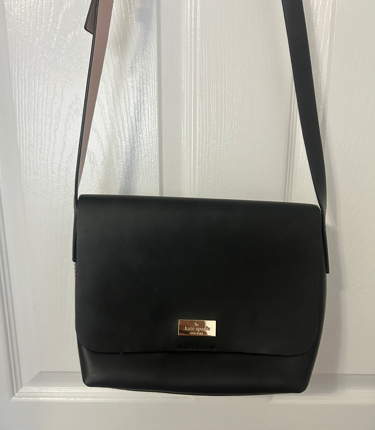 Black leather exterior, pink leather interior. Features an adjustable strap (21”-23”), goldtone logo hardware and a foldover flap with a magnet closure.