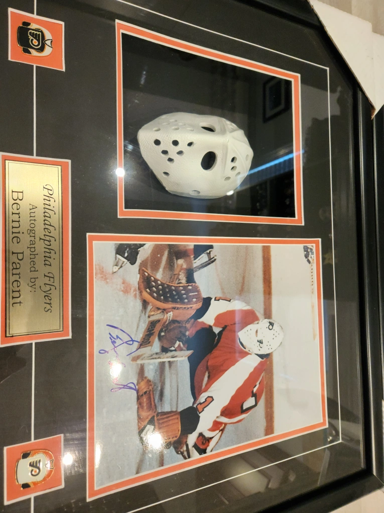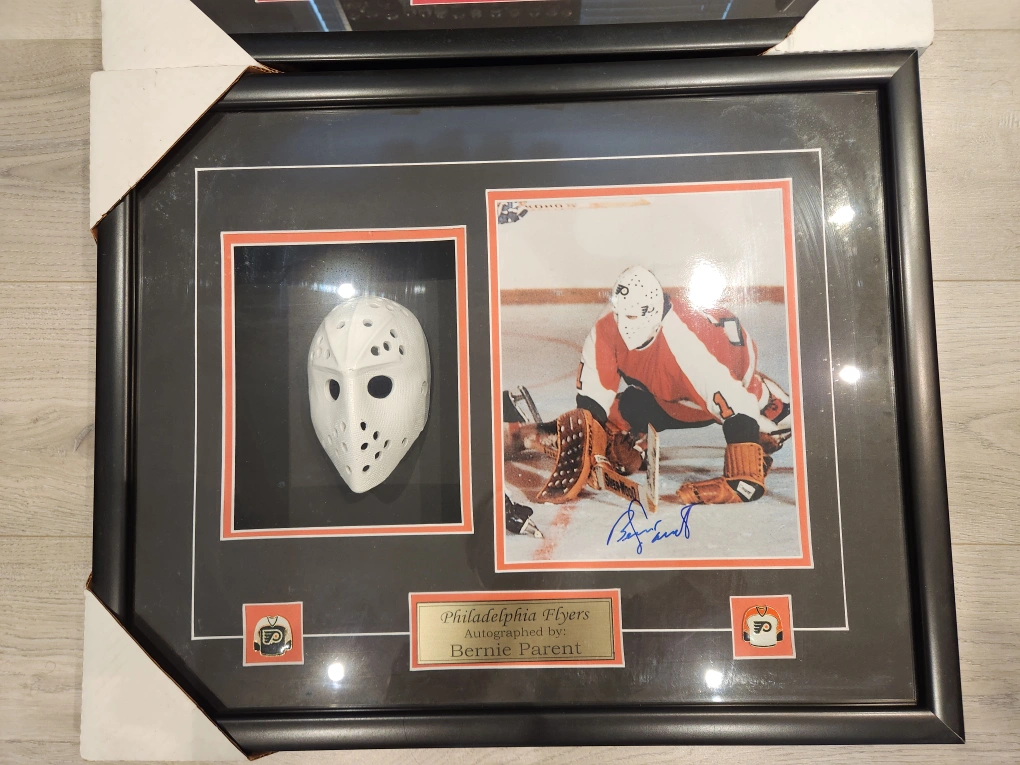 125$ cash - Philadelphia Flyers Legendary HHOF & Stanley Cup Winning Goaltender Bernie Parent Autographed photo framed with mini replica mask. This piece also has commemorative flyers pins, and plaque for Bernies' signature. Custom made 1/1 display. Ready to hang.