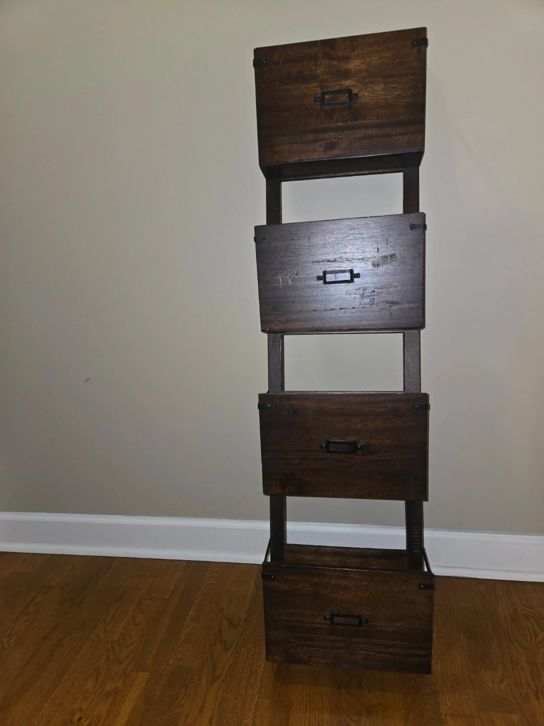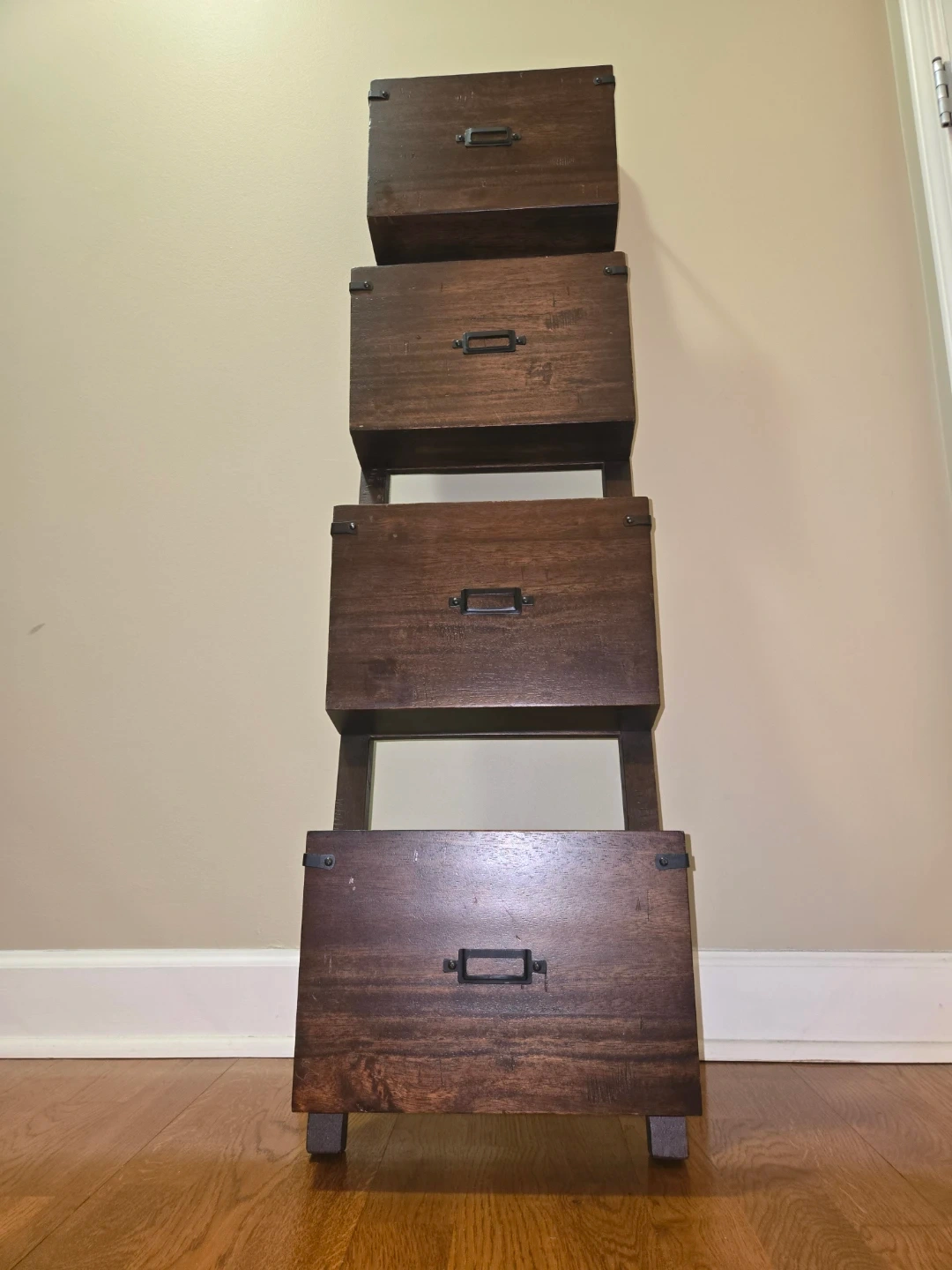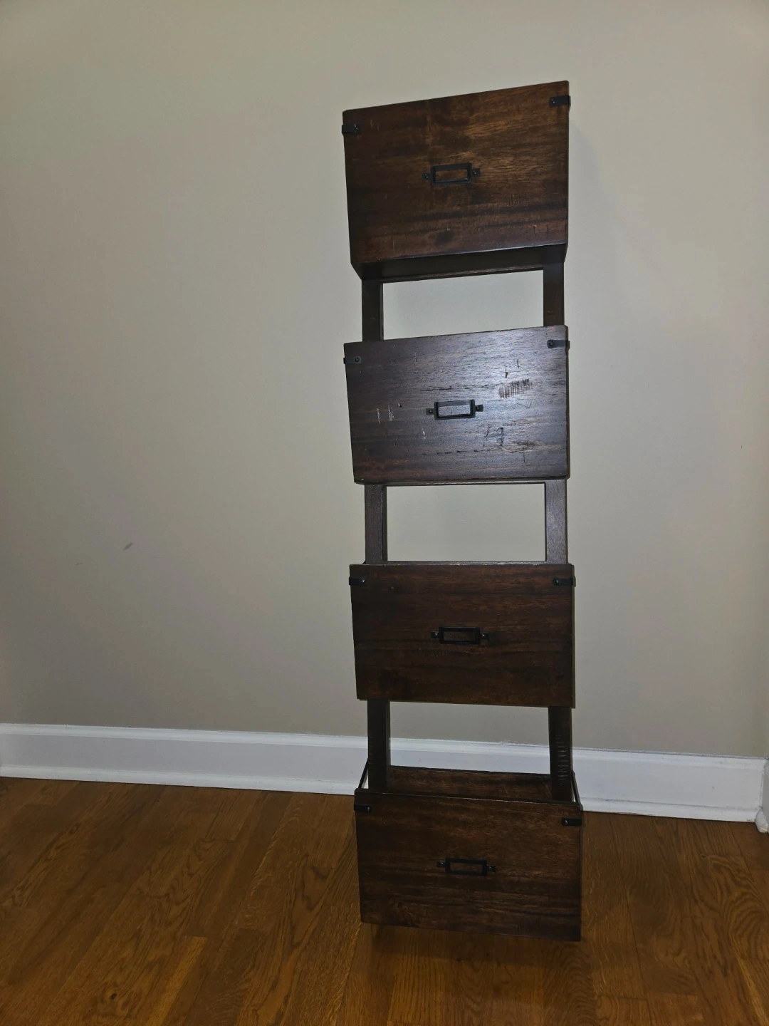 Here is a leaning ladder shelf. It's made of dark wood and has four shelves. It's in good condition and would be perfect for storing books, plants, or other items. This ladder shelf is 4 feet tall, 1 foot wide and 5 1/4 inches deep. Cash and carry only please