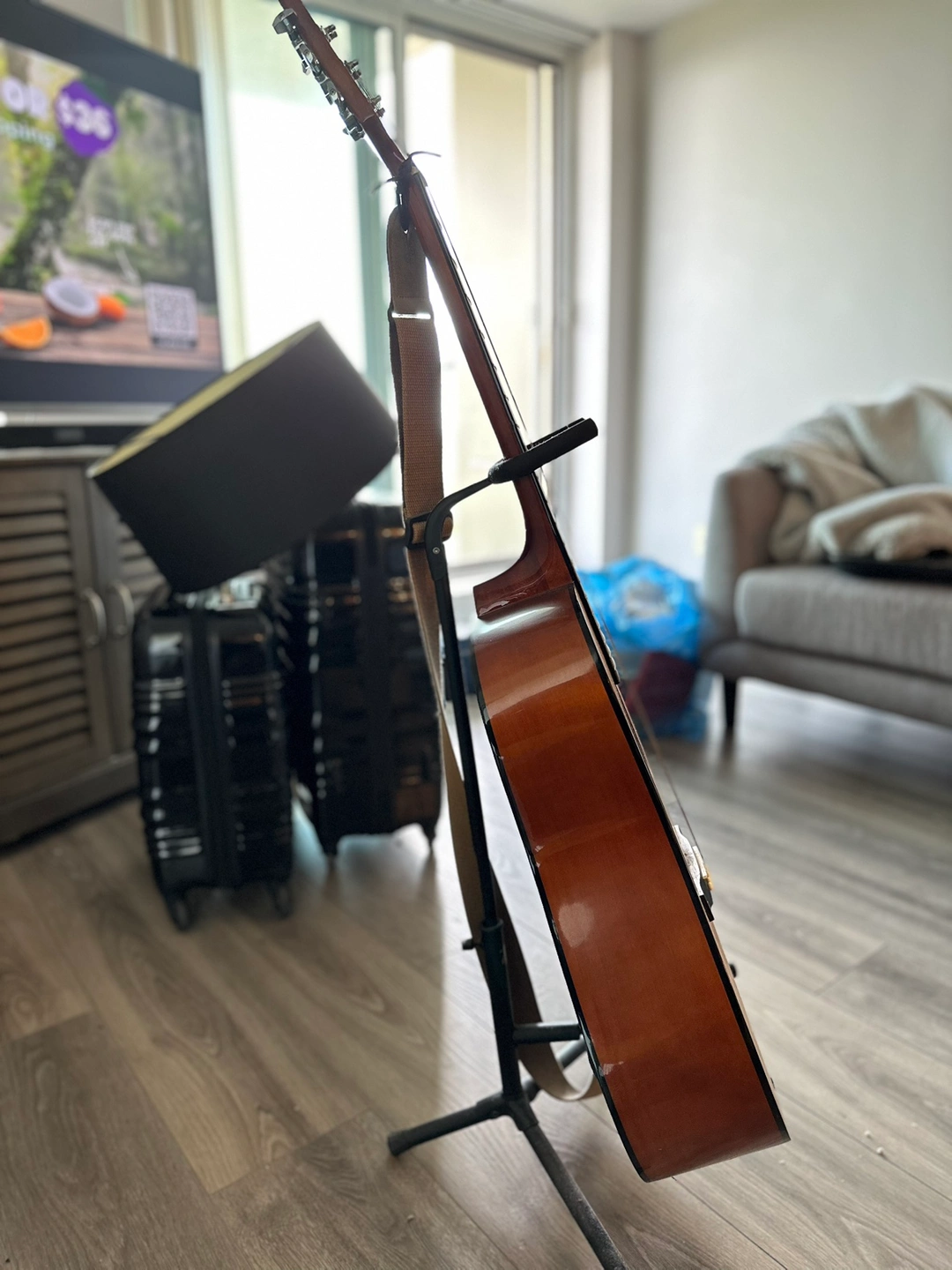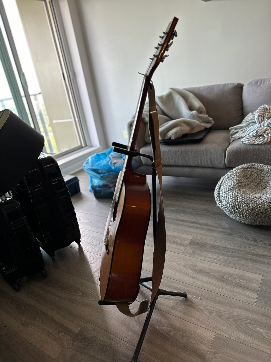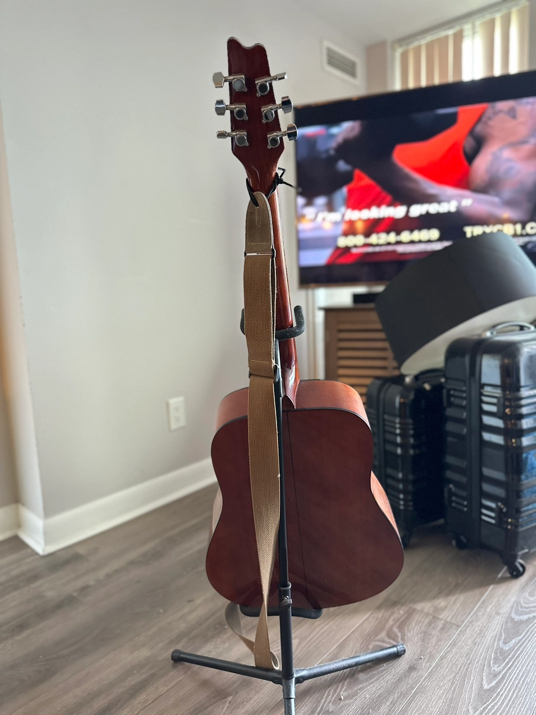 LEFT-HANDED. BARELY USED - JUST A LITTLE DUSTY. Comes with guitar stand.