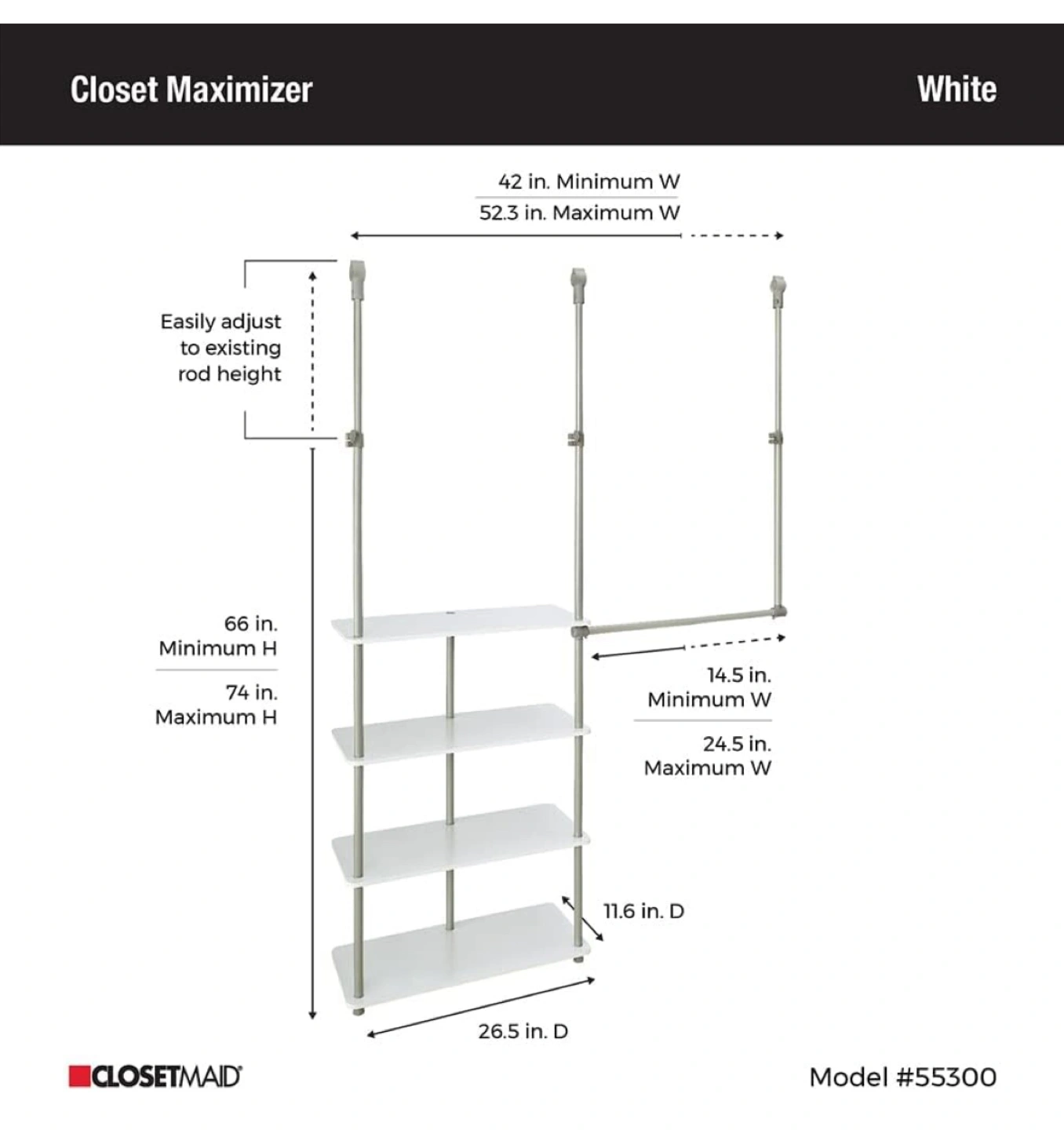 ClosetMaid 55300 Closet Maximizer, White, 11.6 x 53 x 74 inches