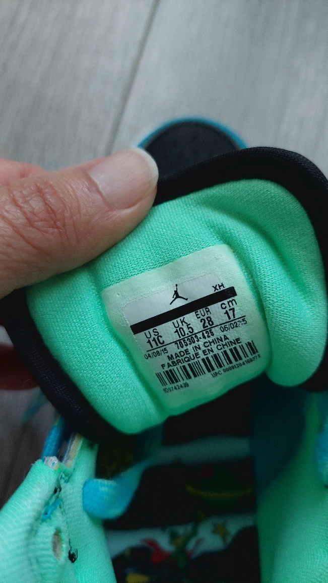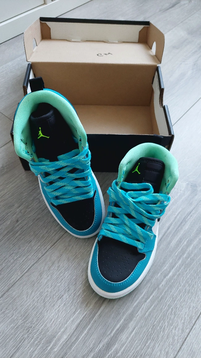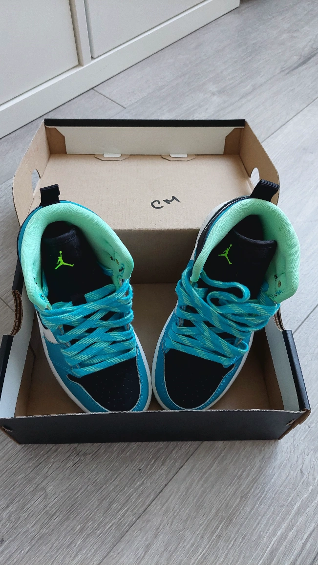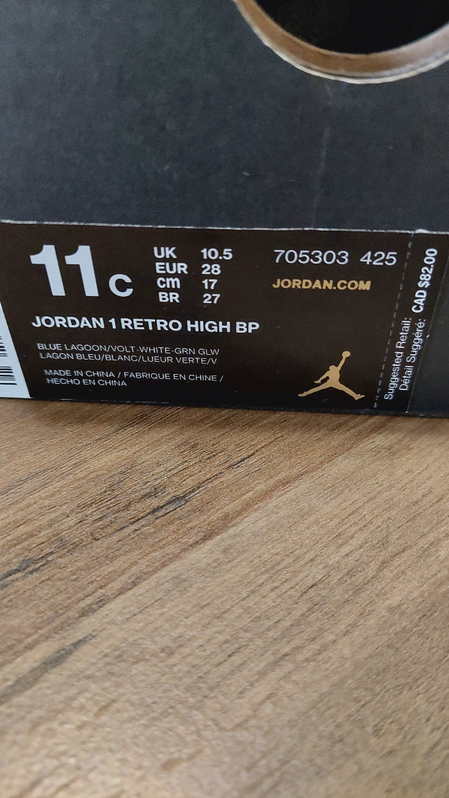 Brand new kids Jordan I Retro High BP sneakers in color Blue Lagoon/ volt-white GRN GLW. Size 11c (refer to size information in the picture). They come in the original box.